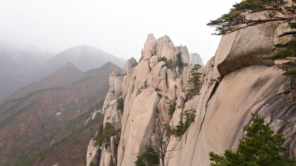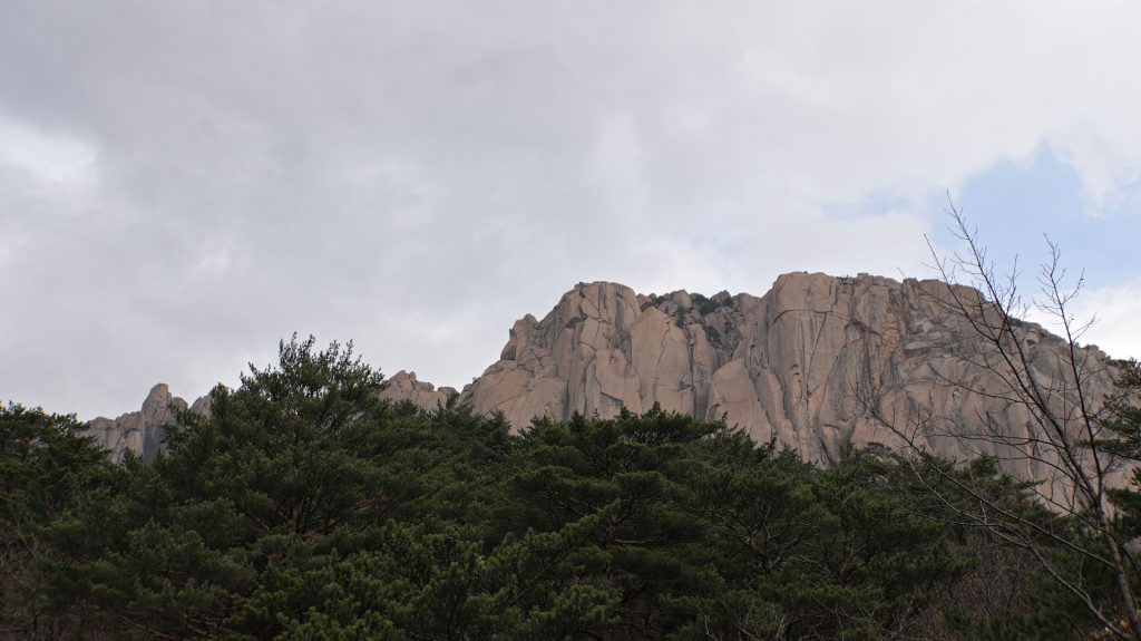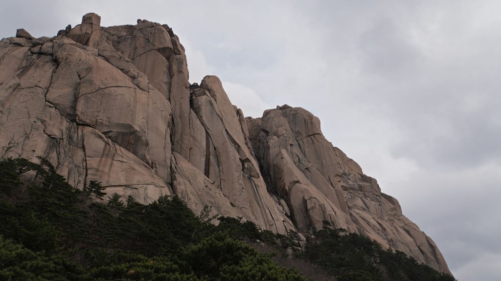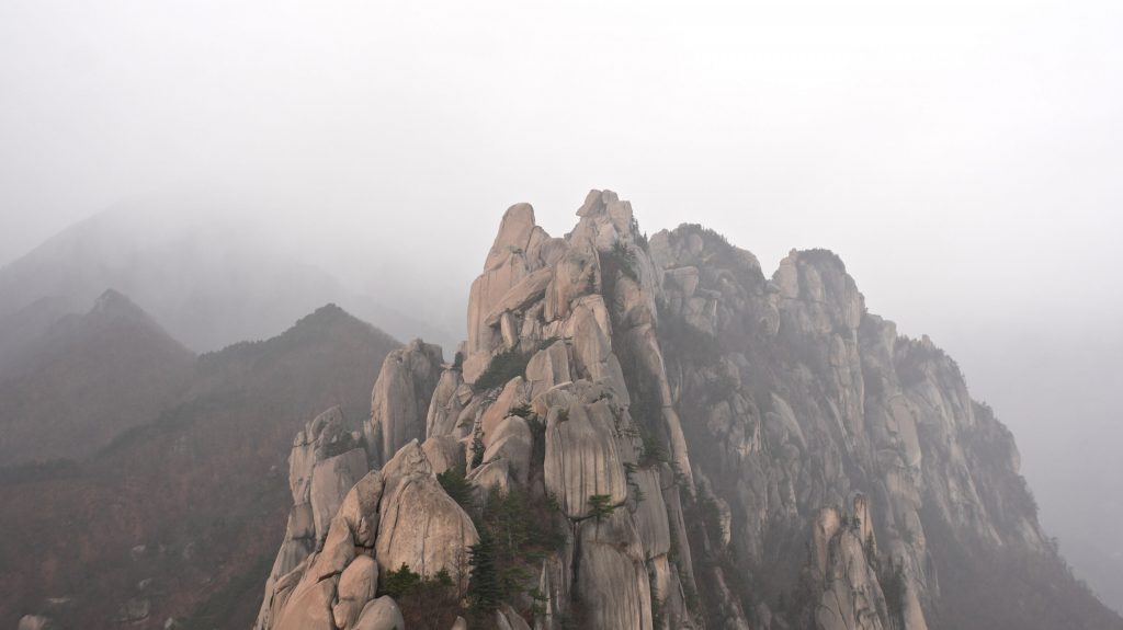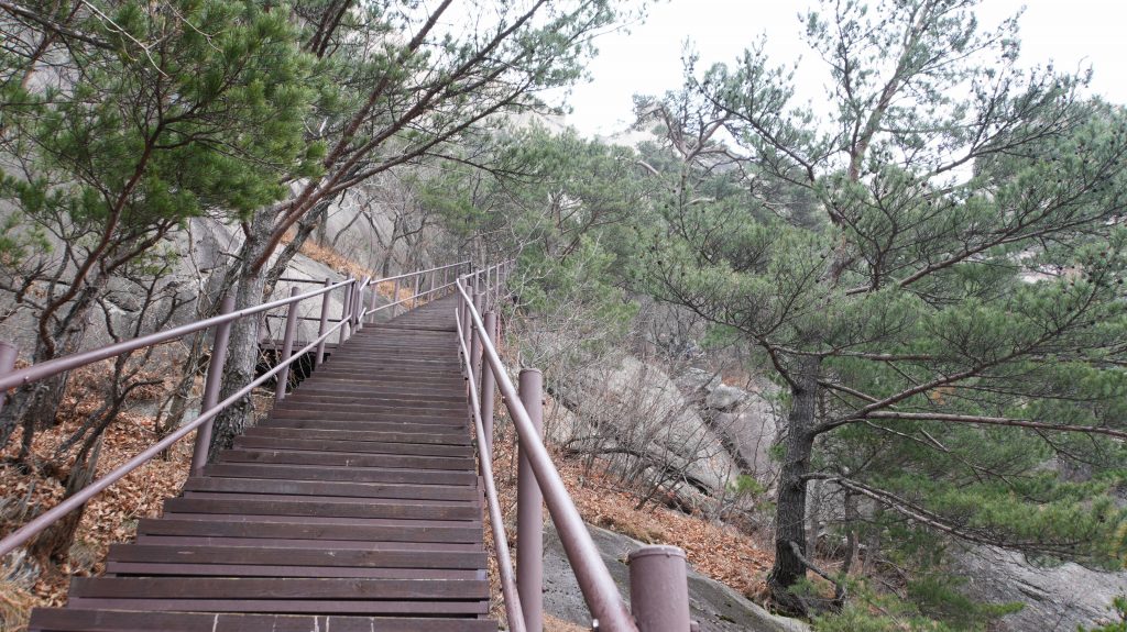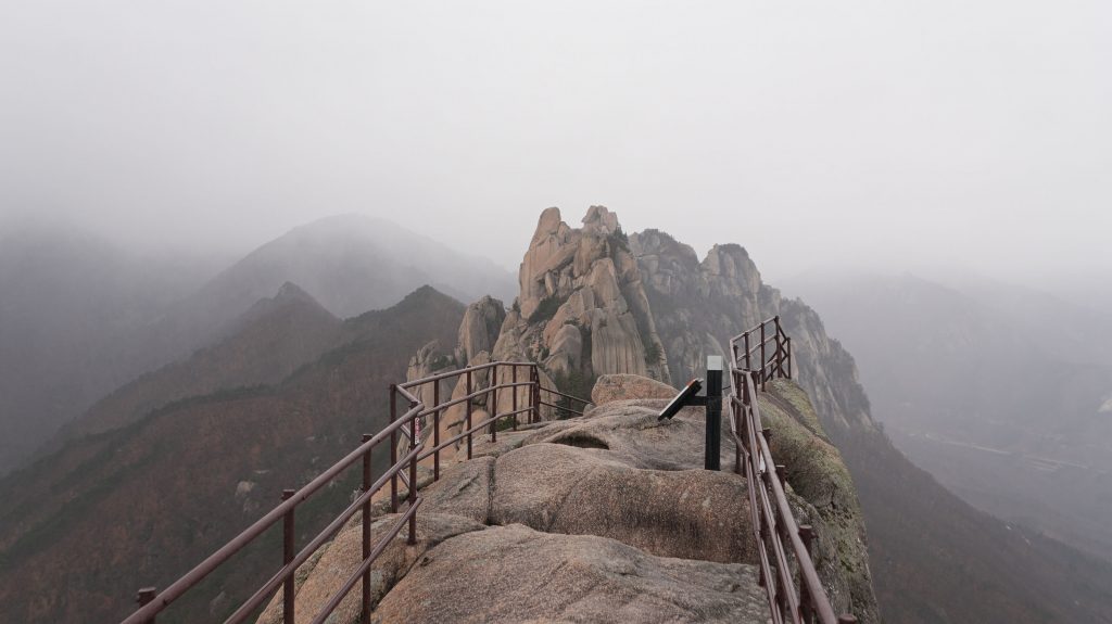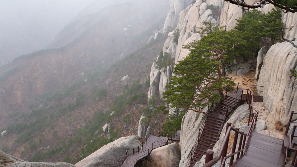 Die Felsen des Ulsanbawi sind fast senkrecht, und so wird auch der Weg exponentiell steiler, bis aus den Stufen eine Stahltreppe wird, die sich in Serpentinen an die Felswand schmiegt. Der Regen wird stärker und kälter, ich sehe immer weniger, weil die Brille von außen voller Regentropfen ist, und innen beschlagen. Am Nachbarberg hat es heute Nacht geschneit, und so viel höher oben ist das nicht.