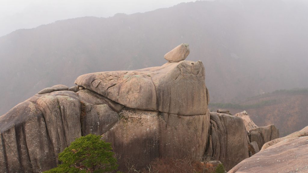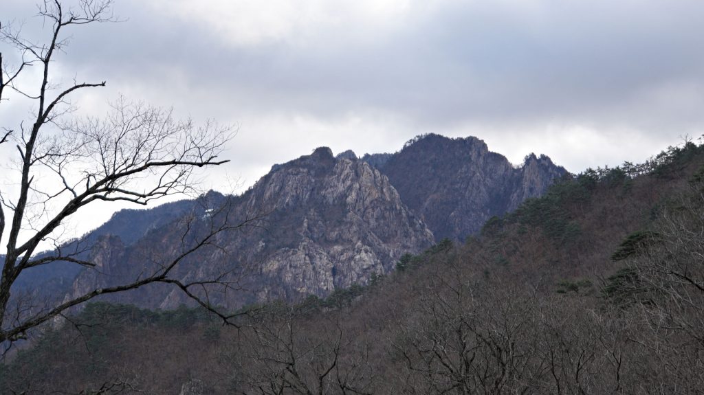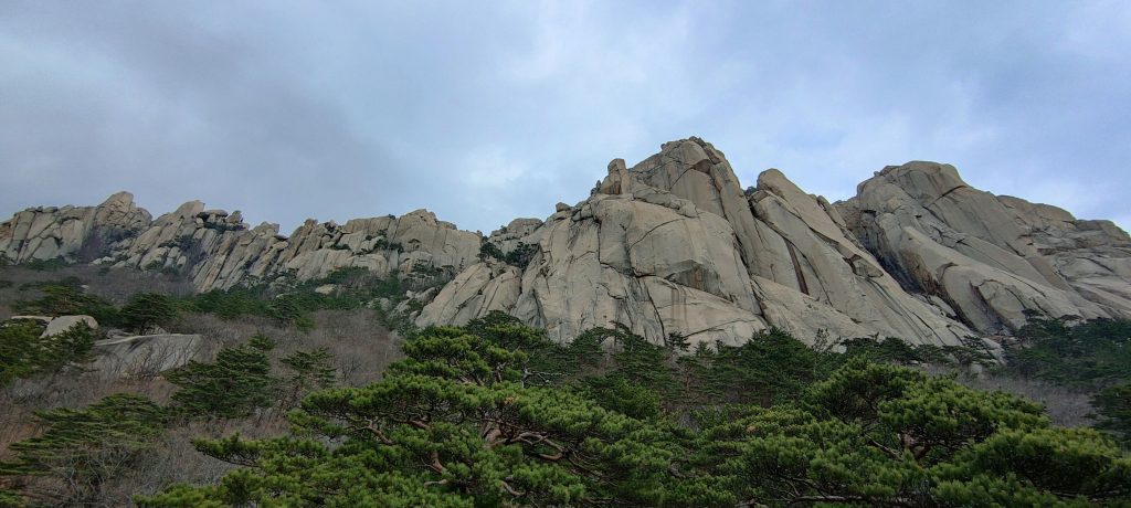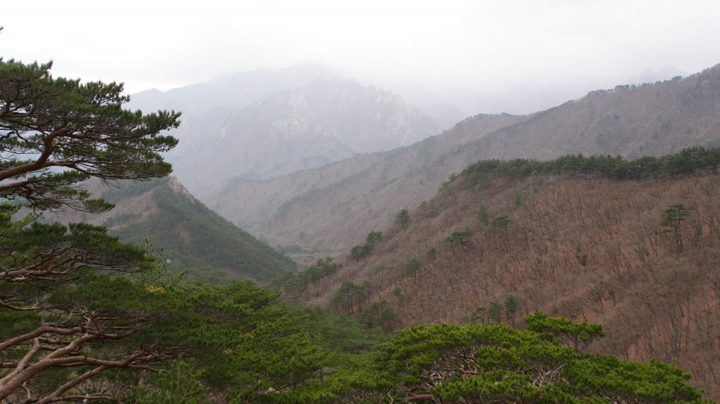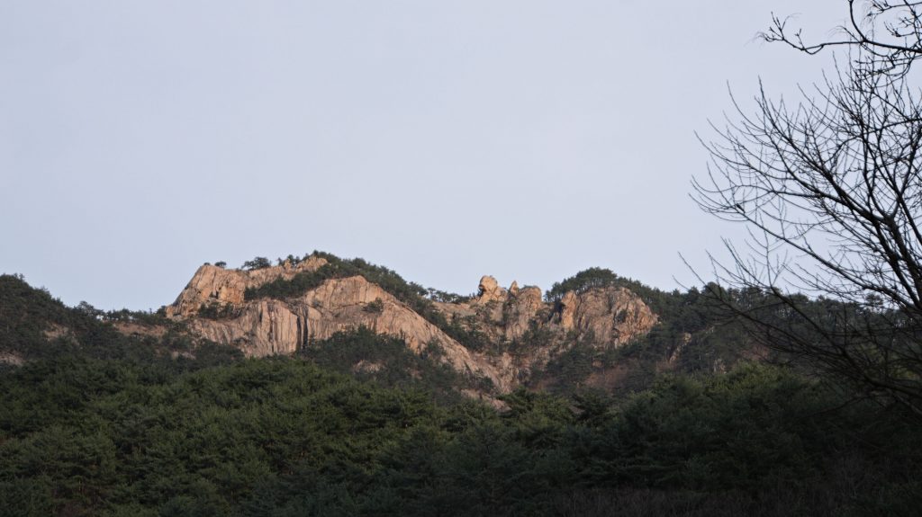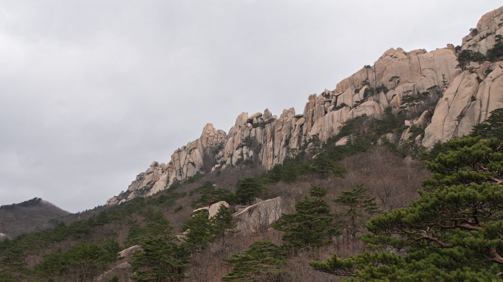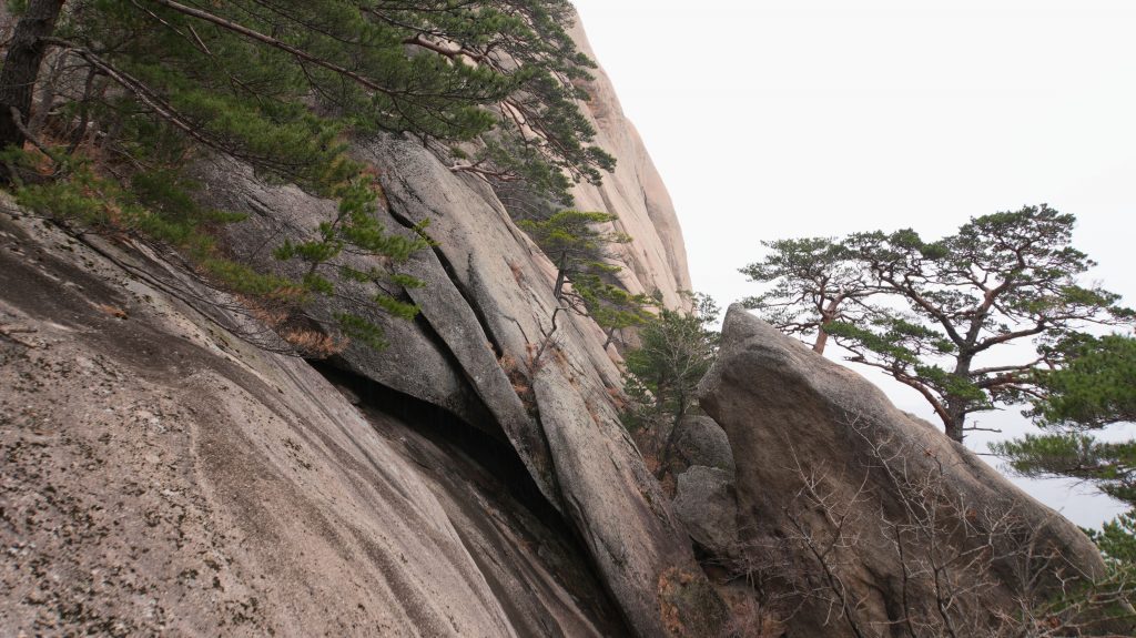 Die Felsen des Ulsanbawi sind fast senkrecht, und so wird auch der Weg exponentiell steiler, bis aus den Stufen eine Stahltreppe wird, die sich in Serpentinen an die Felswand schmiegt. Der Regen wird stärker und kälter, ich sehe immer weniger, weil die Brille von außen voller Regentropfen ist, und innen beschlagen. Am Nachbarberg hat es heute Nacht geschneit, und so viel höher oben ist das nicht.