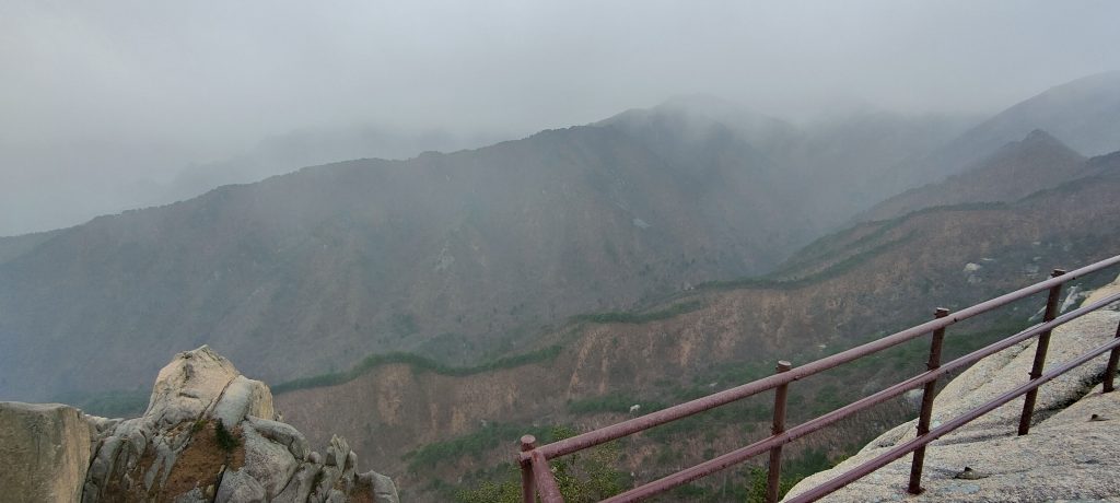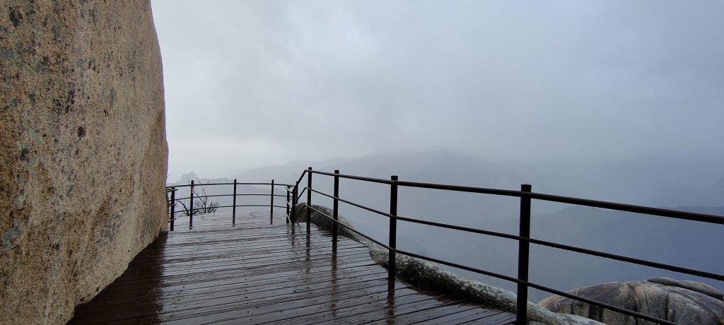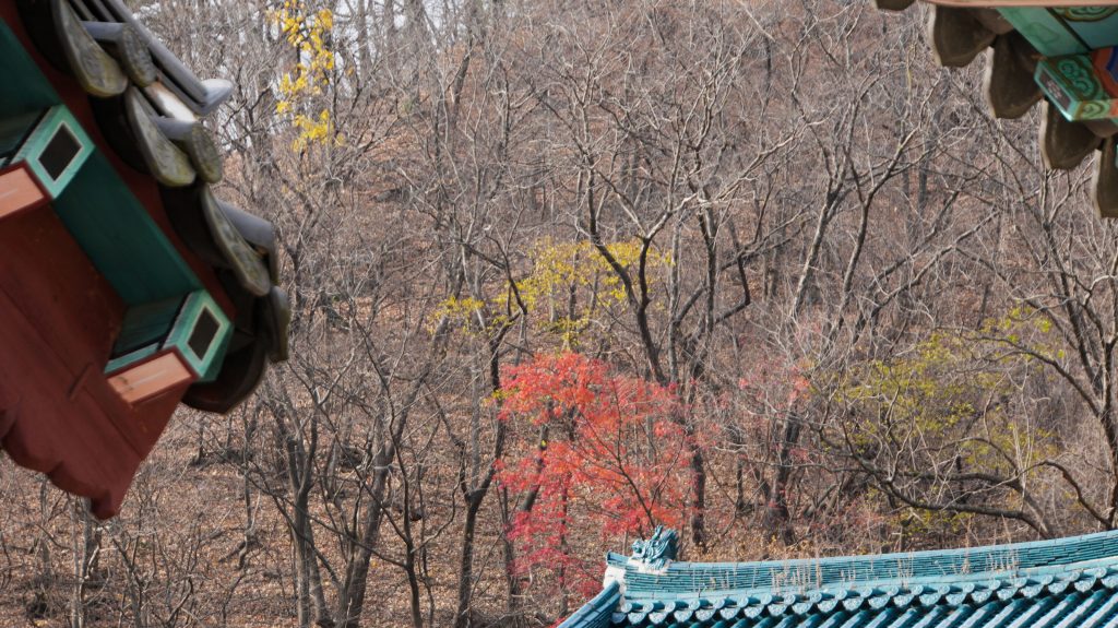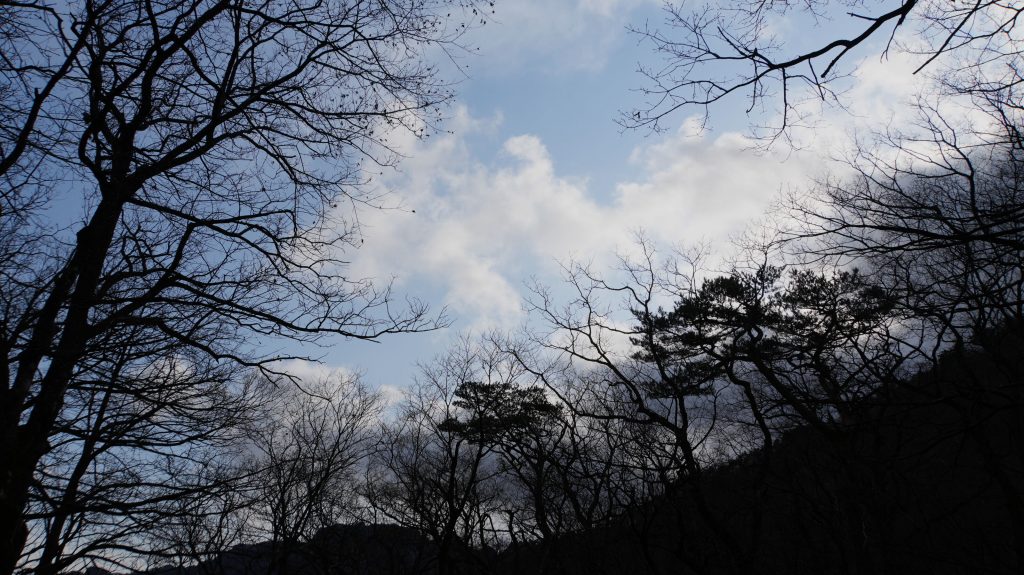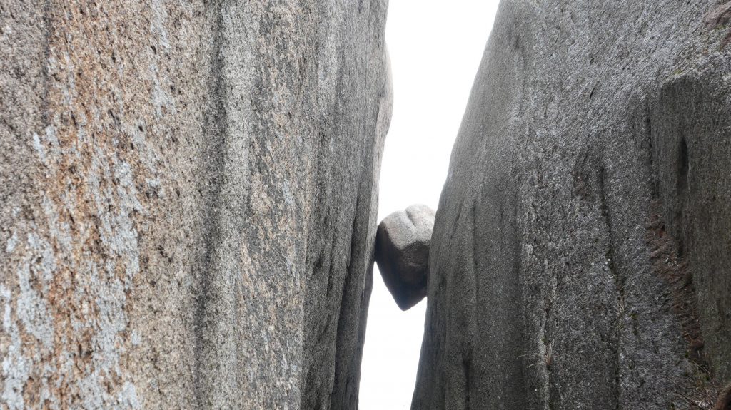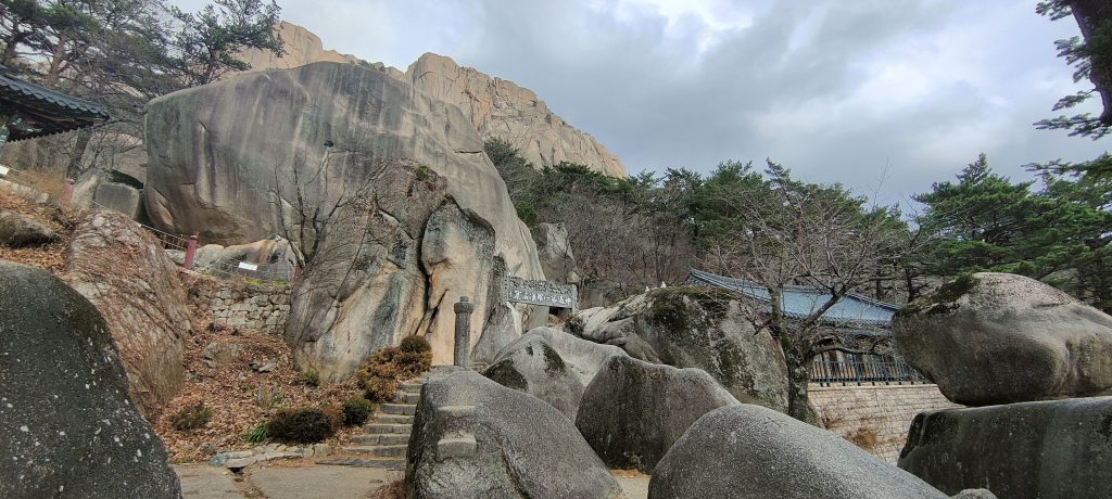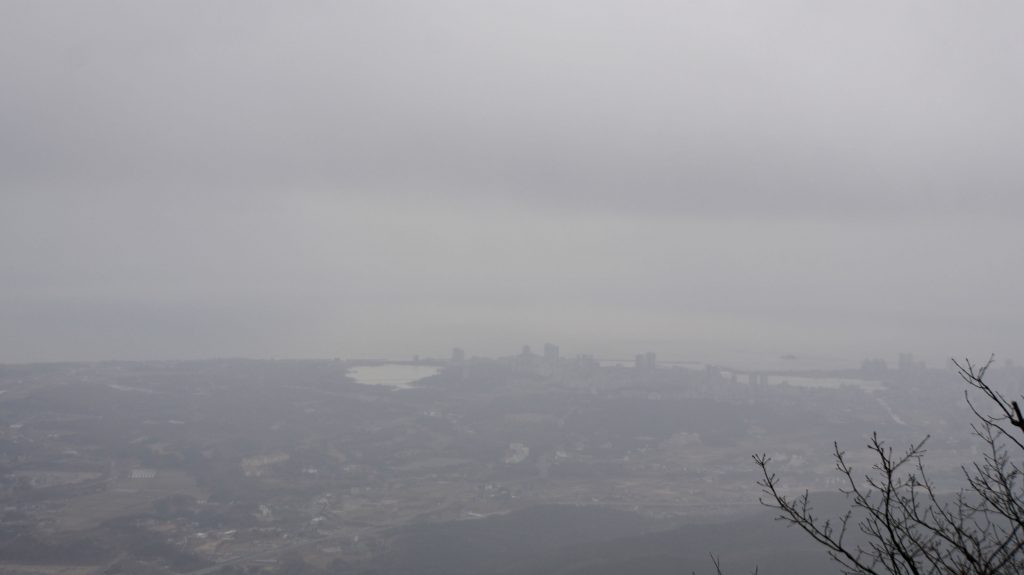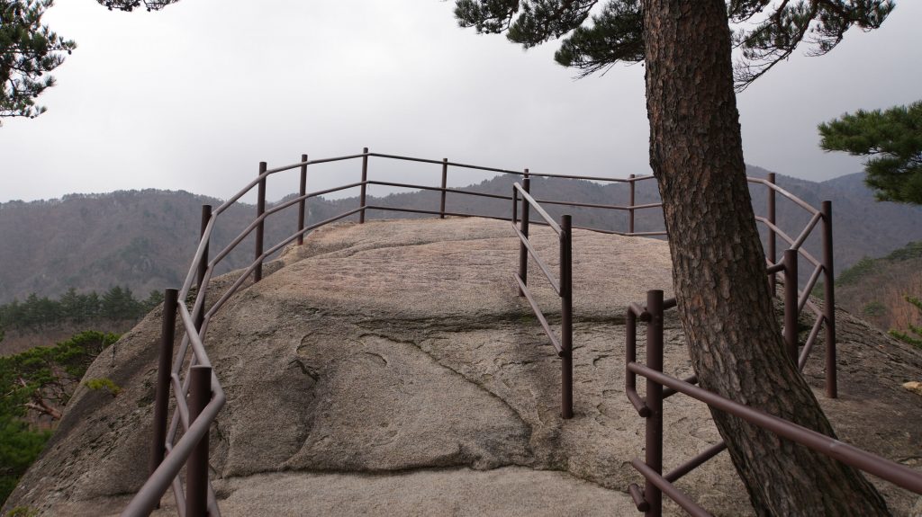 Die Felsen des Ulsanbawi sind fast senkrecht, und so wird auch der Weg exponentiell steiler, bis aus den Stufen eine Stahltreppe wird, die sich in Serpentinen an die Felswand schmiegt. Der Regen wird stärker und kälter, ich sehe immer weniger, weil die Brille von außen voller Regentropfen ist, und innen beschlagen. Am Nachbarberg hat es heute Nacht geschneit, und so viel höher oben ist das nicht.