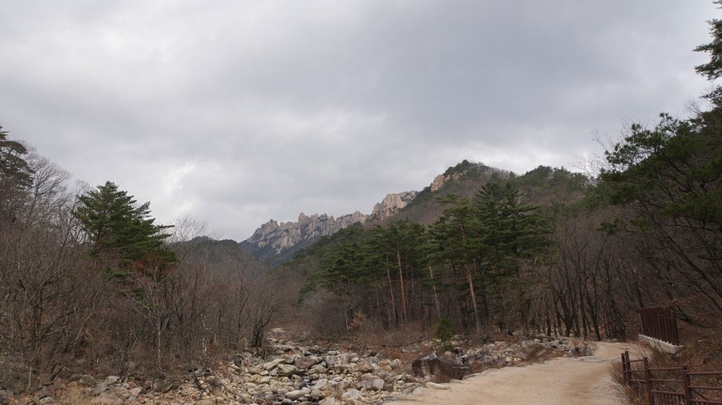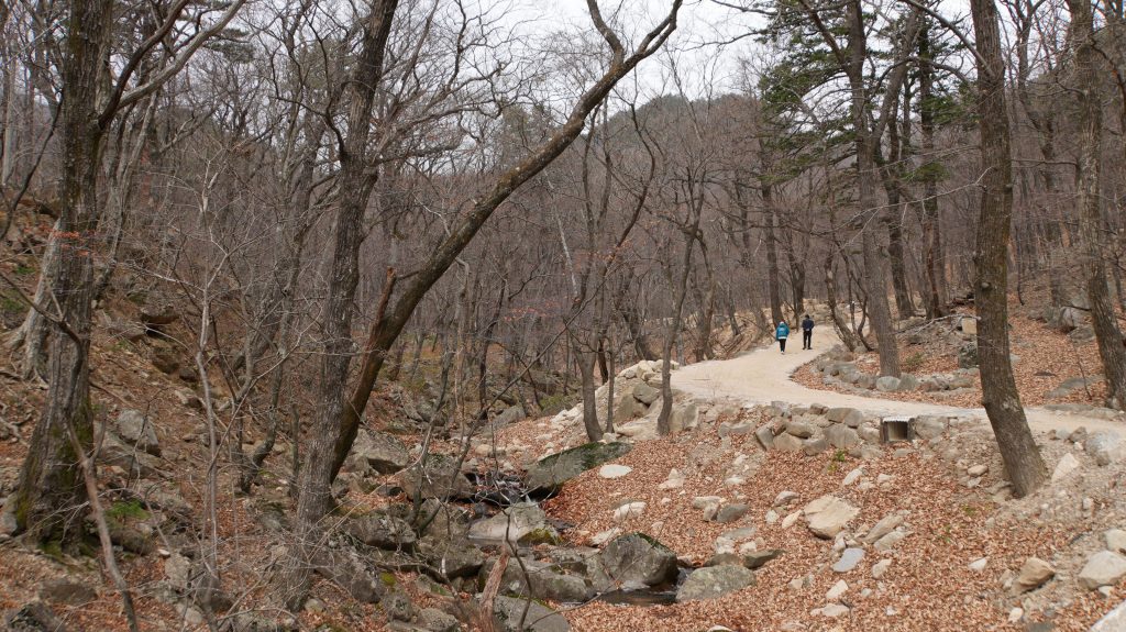 Es geht sehr moderat ansteigend am Fluss entlang, einem anderen Arm des Yongcho-cheong folgend, bis uns ein Eichhörnchen den Weg blockiert. Wir werden eingehend inspiziert und nach zu verzollenden Essbarem gefragt. Da wir wissen, was sich gehört ("Niemals wilde Tiere füttern!"), dürfen wir passieren. In diesem Land sind sogar die Zollbeamten putzig!