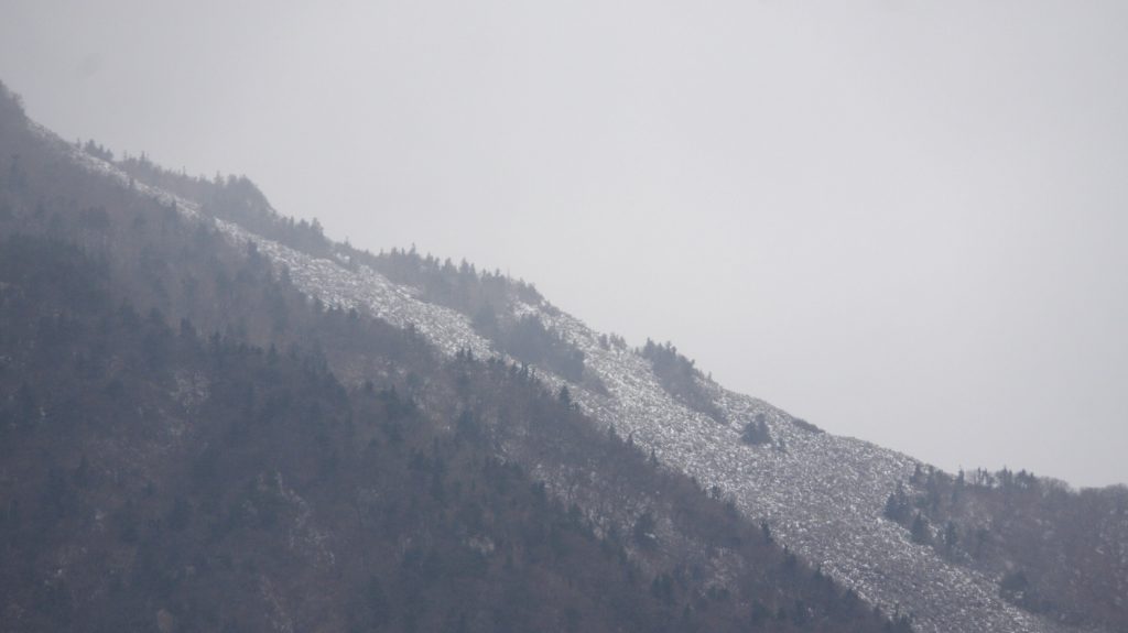 Interessant übrigens, wie sich auf den Kämmen der Rippen unten im Tal ein grünes Band entlang zieht, die Flanken jedoch braun sind. Das liegt vermutlich daran, dass es ganz oben durch den Wind unwirtlicher ist, es gibt weniger schützenden Schnee im Winter und im Sommer fließt das Wasser schneller an, und fruchtbare Erde wird von Wind und Erosion abgetragen. Das halten nur Nadelbäume aus, während an den Flanken Laubbäume dominieren, die jetzt am Ende des Herbstes kahl sind.