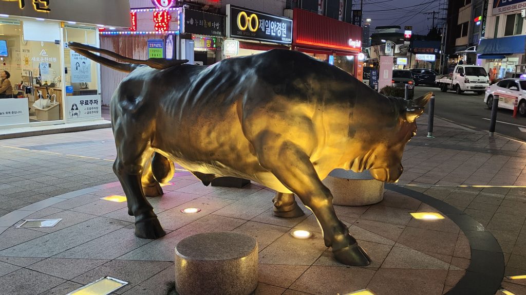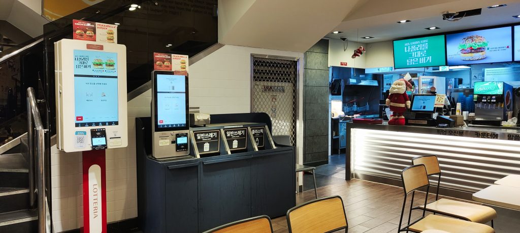 Nachdem eine prall gefüllte Einkaufstasche erworben, will ich jetzt doch mal wissen, wie koreanische Burgerbrater schmecken, und wir setzen uns in die Lotteria. Lotte ist für Südkorea, was Corte Inglés für Spanien ist: Von Wohnburgen über Einkaufsketten, Supermärkte, Burgerbrater bis zum Vergnügungspark hat der Konzern alles im Angebot. Die Burger sind tatsächlich deutlich über McDonalds-Niveau, aber das Ambiente ist ziemlich ähnlich.