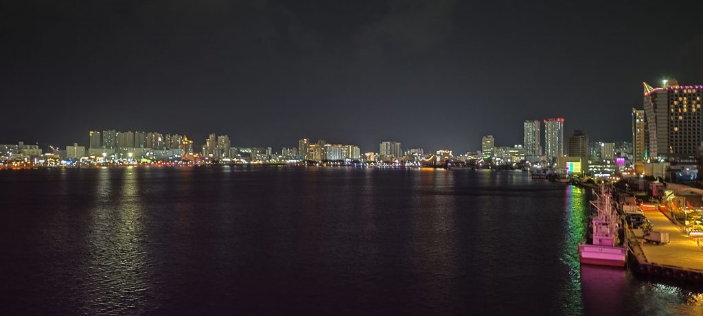 Stöhnend raffe ich mich auf, und wir laufen über die Doppelbrücke etwa vier Kilometer bis zur Shoppingmeile. Hier am Meer ist es auch böig und kalt, aber die Wolken bleiben am Gebirge hängen.