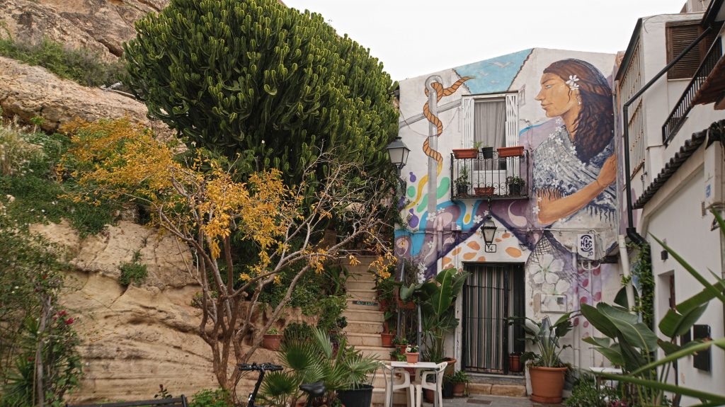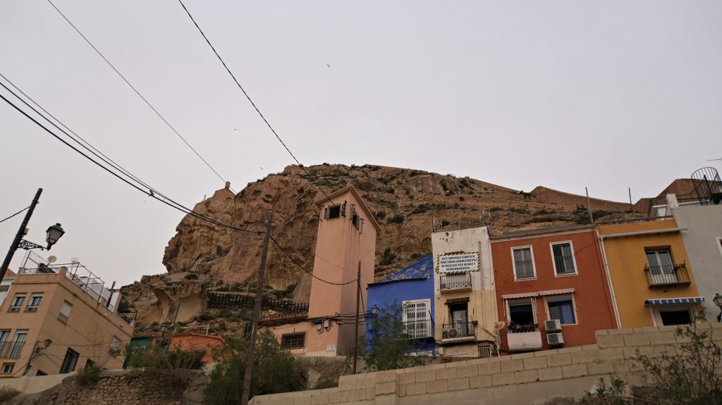 Der Reiher sieht ein wenig maulig und übellaunig aus, aber wir lassen uns nicht anstecken. Hinter dem Playa de Postiguet sind nur wenige Häuserreihen, bis es steil zum Monte Benacantil aufwärts geht. Die letzte Häuserreihe ist umstritten, denn einerseits ist es hier wunderschön, und es wirkt wie eine eingeschworene Gemeinschaft von Nachbarn. Andererseits ist der Hang instabil, und die Häuser sind in Gefahr, bei einem Hangrutsch verschüttet zu werden. Schwierig, ich hoffe, dass man hier etwas mit Hangbefestigung und Schutzmauern tun kann, es wäre schade, wenn das abgerissen werden müsste.