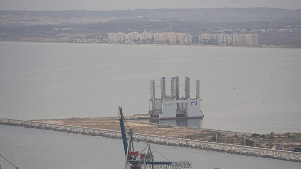 Die Plattform "Mar del Enol" im Hafen ist interessant, sie ist eine sogenannte Jack-Up Platform. Die Streben an der Plattform können nach unten gefahren werden, um sie am Meeresgrund zu befestigen. In der Mitte befindet sich ein Kran, und da die Enol dann extrem stabil ist, kann von dort dann ein Windrad relativ einfach am Meeresboden aufgestellt werden.