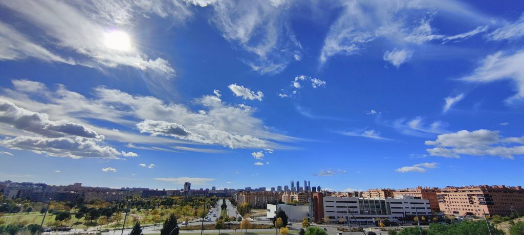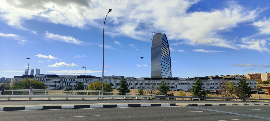 Vom eiförmigen BBVA-Hochhaus geht es über die breite Autobahn nach Sanchinarro, wo ich den Radweg schon bei km 1 bereits verlasse. Die Ringautobahn M-40 ist von den Stadtteilen hier durch einen langgezogenen Hügel getrennt, den ich schnell hochlaufe um die Aussicht zu genießen.