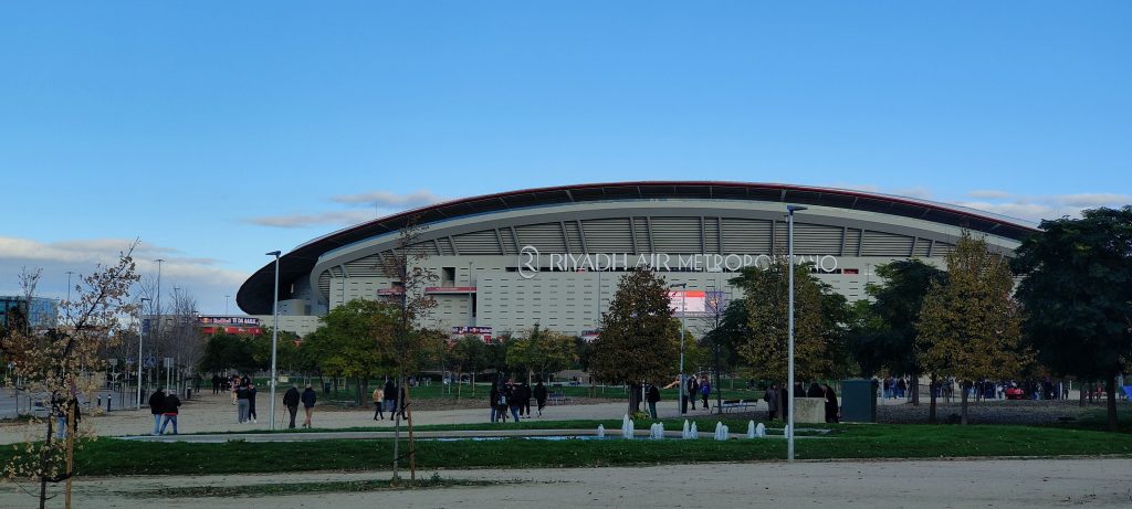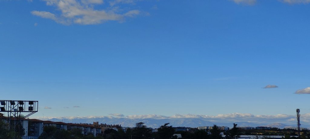Es geht auf einen flachen Hügel, auf dem das Stadium von Atlético Madrid steht und wo es – wenn man sich umdreht – einen tollen Blick auf die Berge hat.