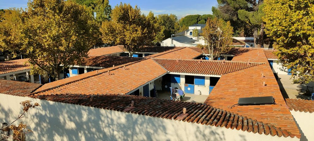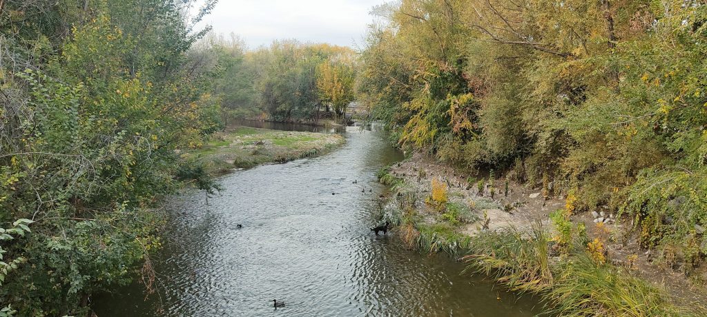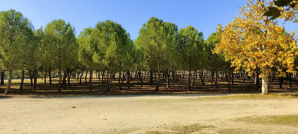 Nach den farbigen Skulpturen geht es bald in den nächsten Park, und dann überquere ich den reissenden Strom Manzanares in all seiner Pracht. Danach geht es unter der Hochgeschwindigkeitsstrecke, die Madrid mit Valencia und Sevilla verbindet durch den Tunnel. Auf der anderen Seite geht es wunderschön durch einen Pinienwald, bis ich pünktlich zum Sonnenuntergang El Pozo erreiche.