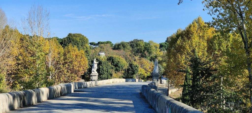 Ich komme zwar nicht so schnell voran wie die Jogger, die mich die ersten Kilometer begleiten, aber dafür stetig. Die Dreiergruppe ist zwar schnell, aber bleibt alle paar hundert Meter zum Verschnaufen stehen, und dort hole ich sie immer wieder ein. Recht schnell erreiche ich Kilometer 45, dann geht es über die A-6 in einen engeren Streifen Park entlang des Manzanares, den ich dann auf der inzwischen deutlich überdimensionierten alten Steinbrücke überquere.
