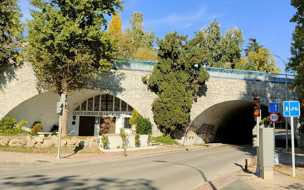 Das nächste Stück ist das hässlichste, eingequetscht zwischen der M-30 und einer Mauer zum königlichen Golfplatz ist eigentlich kein Platz für Fußgänger. Glücklicherweise ist der Abschnitt kurz, und nach dem Passieren der 50 km-Marke geht es bald in ein Villenviertel in der Biegung der M-30 und dann in ein schickes Neubaugebiet namens Arroyo del Fresno. Unter der Autobahnunterführung ist lustigerweise eine Kirche in die Brücke integriert.