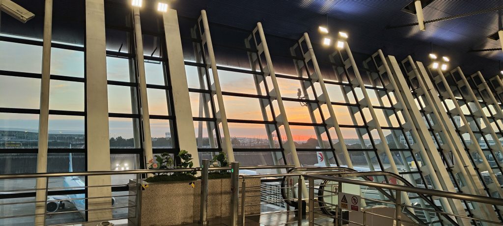 Nachdem wir uns durch Security und Passkontrolle zum neuen Gate manövriert haben, geht die Sonne über dem gelben Meer auf.
