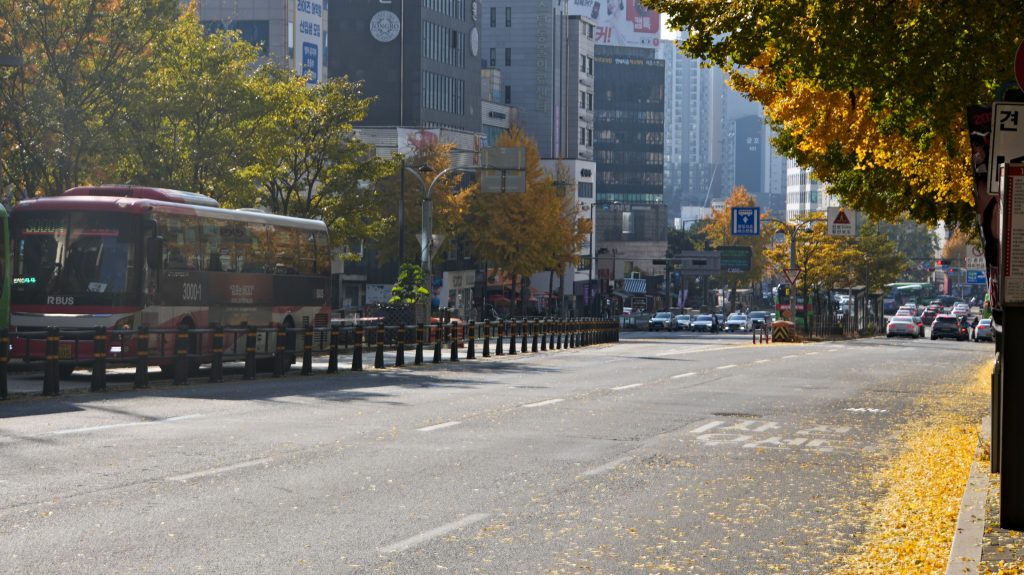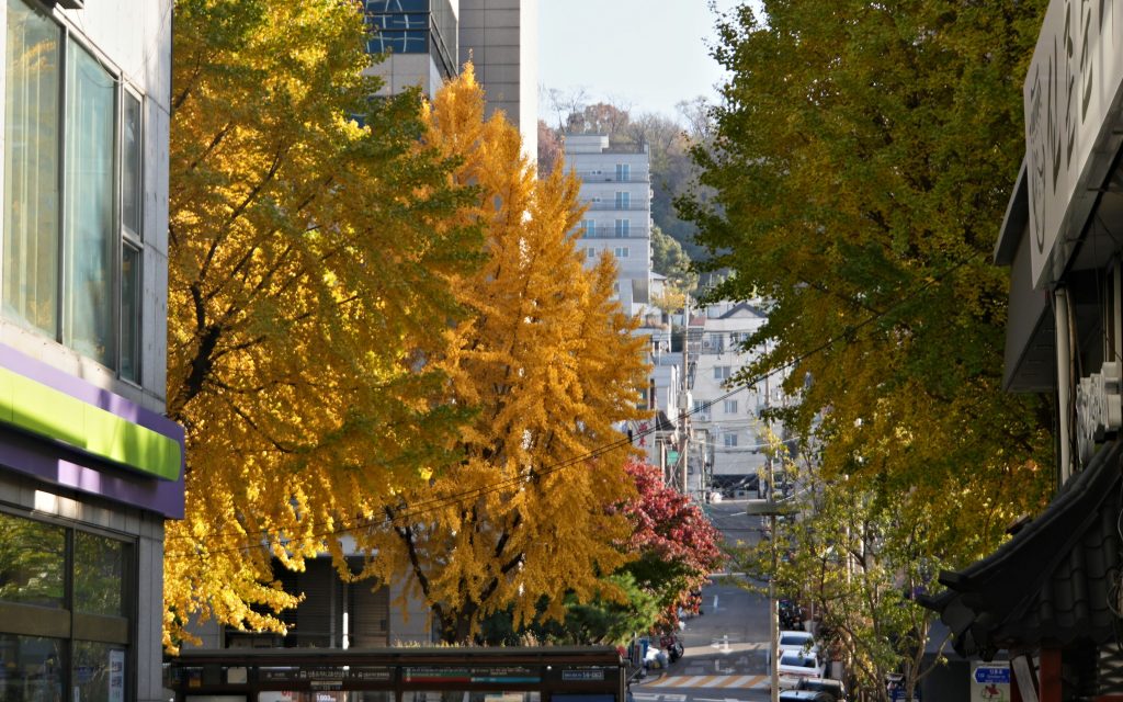 Unser Hotel ist im Stadtviertel Sinchon der 10 Millionen-Stadt, es ist hier sehr urban – breite Straßen mit hohen Häusern. Und überall Gingko-Bäume, die jetzt im Herbst leuchten gelb sind, und alle Blätter verlieren. Darum sind die Straßen und Gehwege von gelben Blättern geflutet, es sieht fantastisch aus – allerdings nur solange man die Blätter nicht zusammenfegen und entsorgen muss!