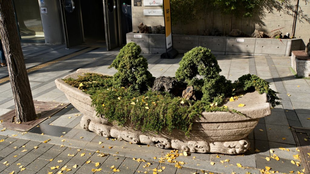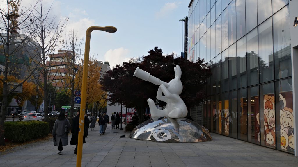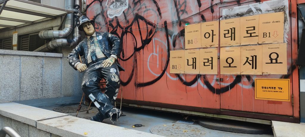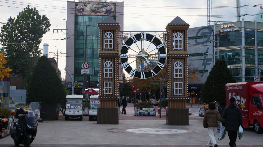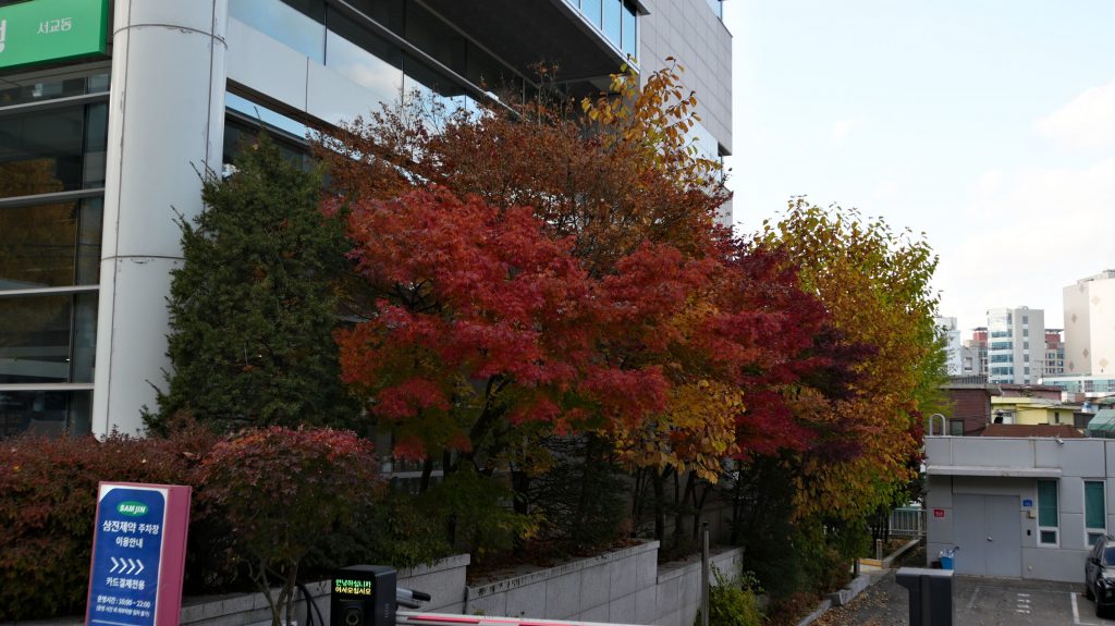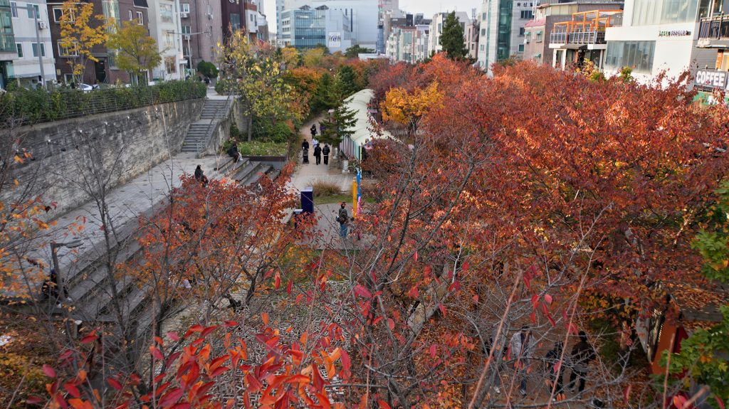 Nachdem wir die Koffer im Hotel gelassen haben, laufen wir nach Hondae, wo wir Marc treffen. Der Stadtteil beherbergt die Hongik-Universität und ist entsprechend hip. Die Menschen sind oft auffällig und meist stilvoll gekleidet, und die Cafés und Geschäfte passen dazu. Auf dem Weg kreuzen wir den Gyeongui-Park, ein über 6 Kilometer langer Park entlang einer alten Eisenbahnstecke. Die Ahornbäume leuchten wunderschön orangerot!
