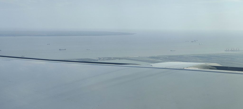 Der Weiterflug nach Seoul / Incheon ist in einem deutlich älteren Flieger, und ich wundere mich bald, ob wir im richtigen Flieger sitzen. Anstatt nordöstlich über das Meer fliegen wir entlang der Küste nach Norden bis fast nach Qingdao, um dann in einer engen Kurve nach Osten abzudrehen. Statt der etwa 800 Kilometer Luftlinie fliegen wir eher 1200 Kilometer. Die künstliche Intelligenz vermutet das selbe wie ich: Vermutlich ist der Luftraum wegen Militärmanöver gesperrt, und findet Berichte, dass China gerade mal wieder eine Machtdemonstration vor Taiwan durchführt. Ob das wirklich der Grund ist, kann ich nicht sagen, Taiwan ist schliesslich 1000km südlich von Shanghai.