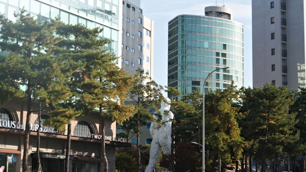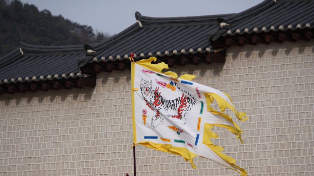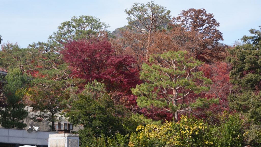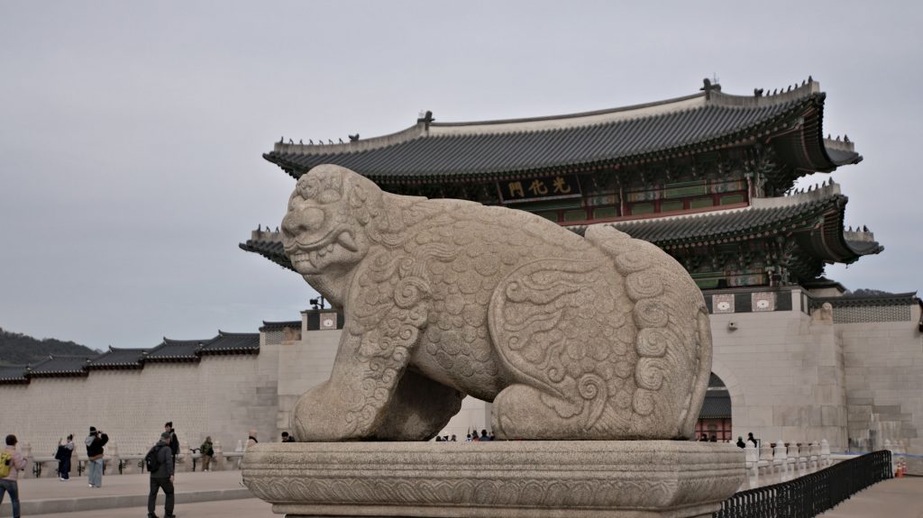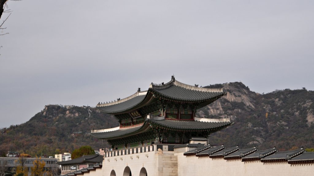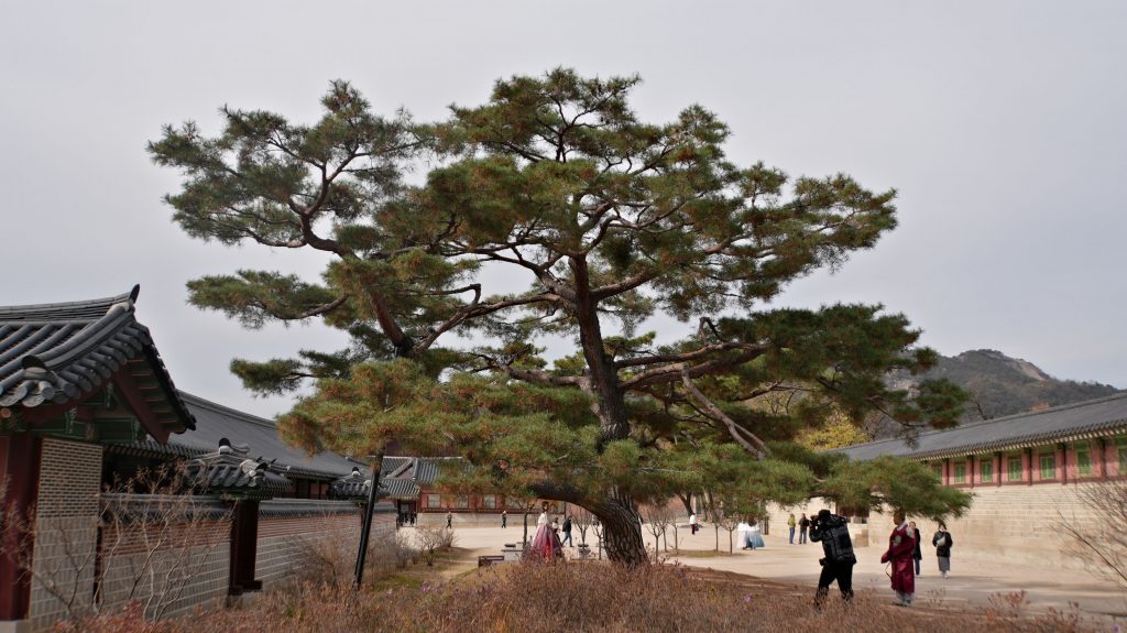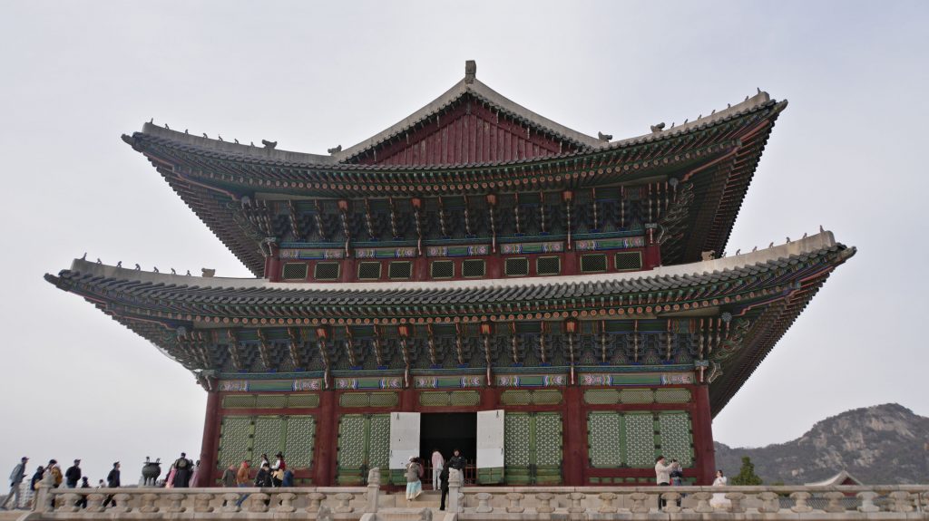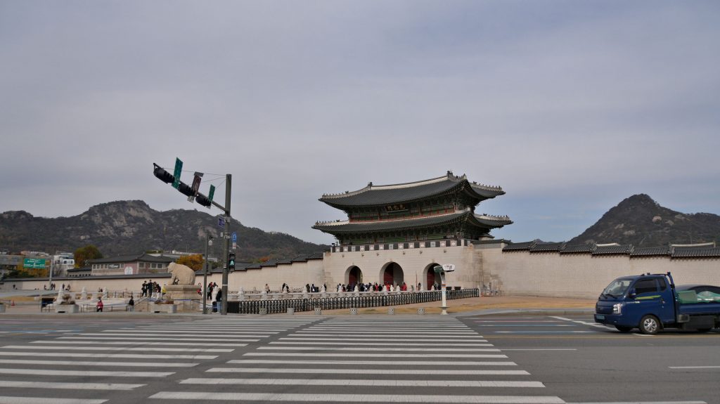 Wir starten mit einer Busfahrt zum Gyeongbokgung-Palast. In der Stadt gibt es fünf Paläste, dieser ist der Größte und er wurde ursprünglich im 14. Jhdt. erbaut. Nach mehrfachen Zerstörungen und Wiederherstellungen ist er im aktuellen Zustand erst 30 Jahre alt, das fällt aber nicht auf. Hier angekommen wird uns klar, wie bergig die Gegend ist, über 300 Meter sind die Gipfel der in der Stadt verteilten Hügel, bei einer nur wenig über dem Meer liegenden Stadt.
