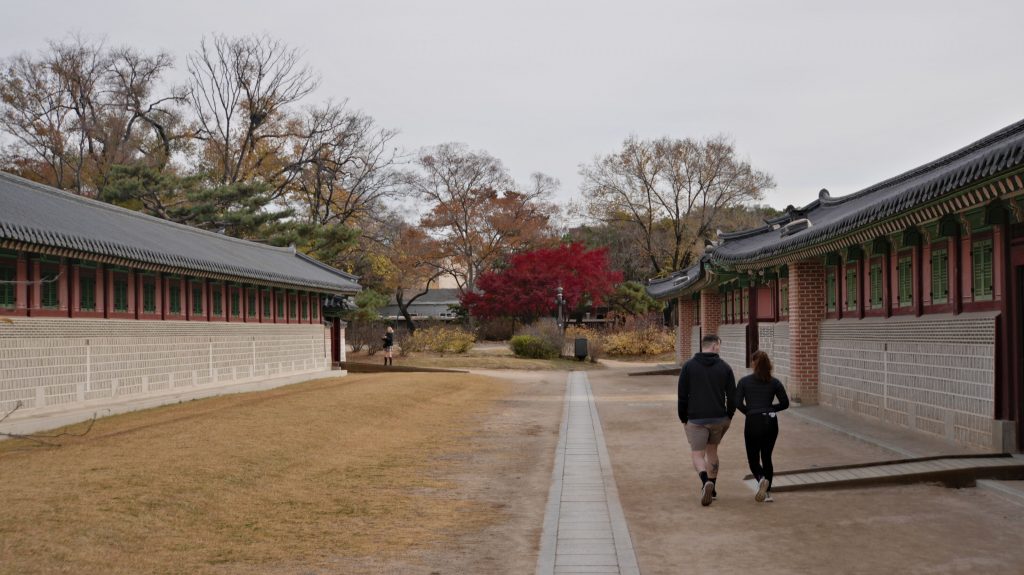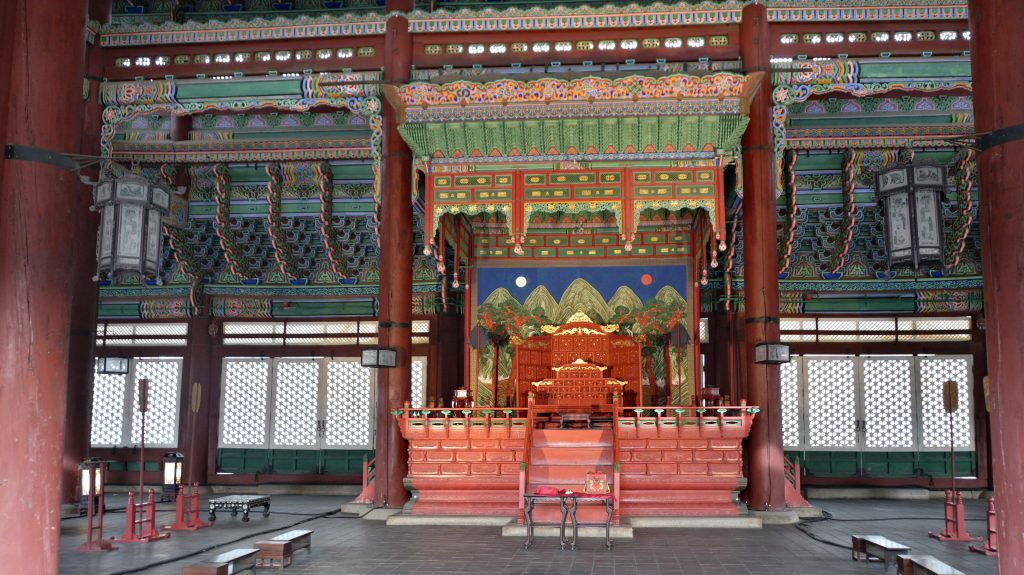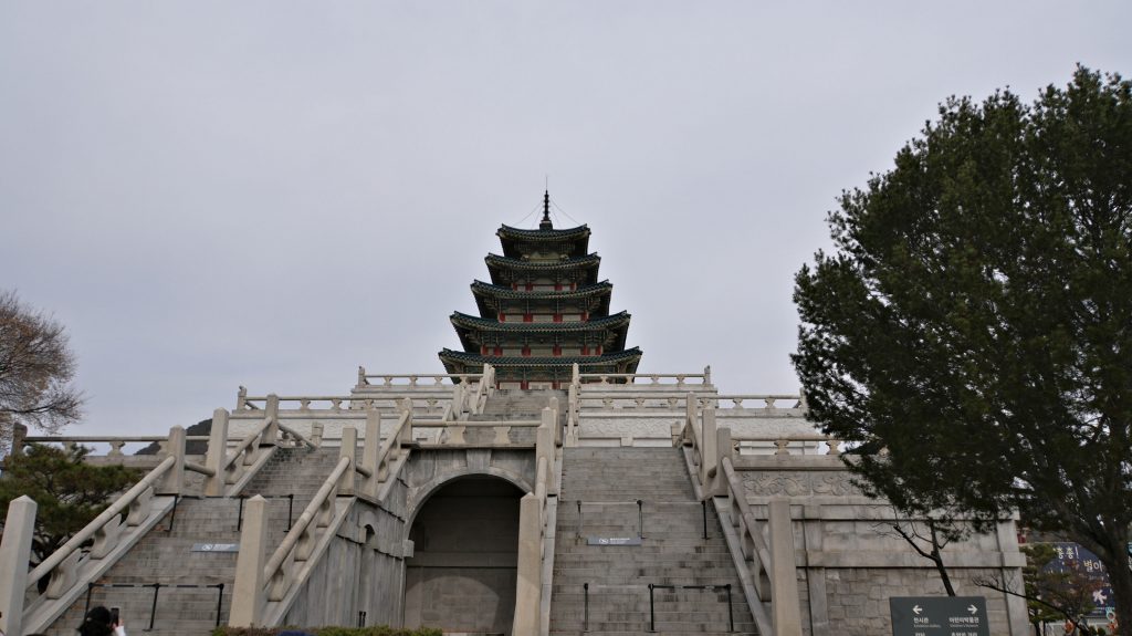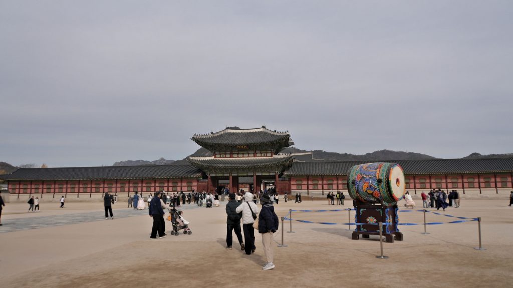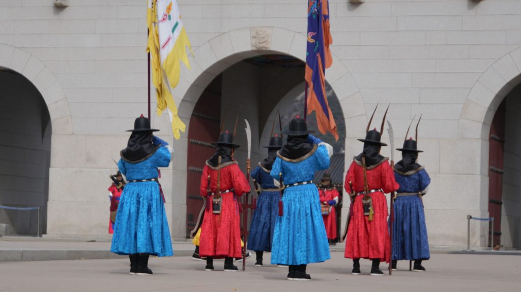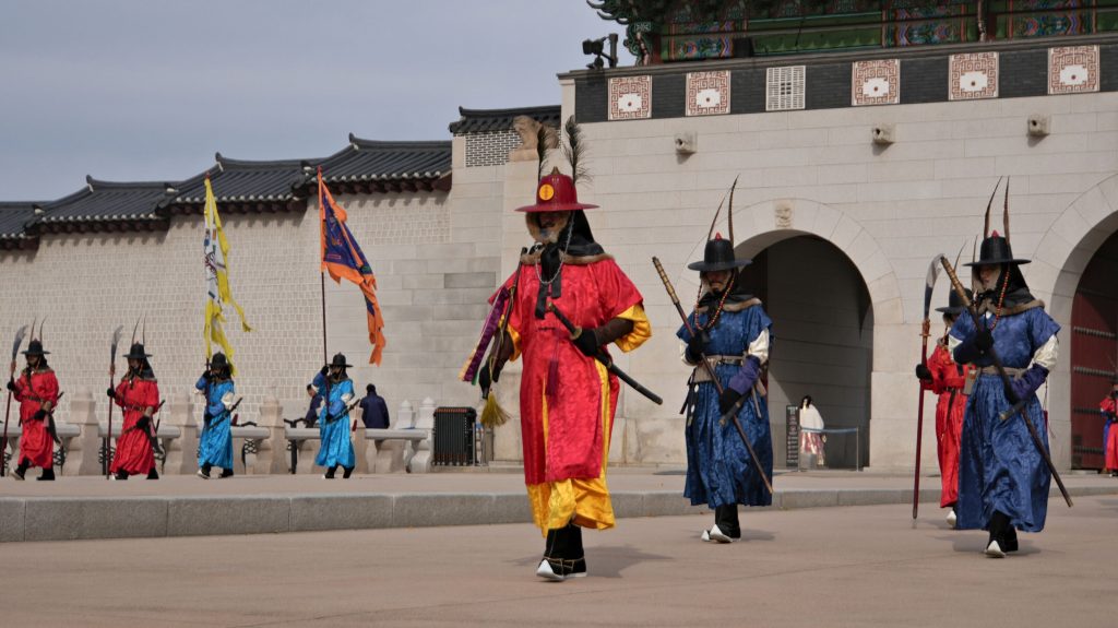 Als wir eintreten wollen, werden wir erst einmal von Ordnern verscheucht. Ein wenig verwirrt treten wir vom Eingang weg, aber nach kurzer Wartezeit wird klar, warum: Es ist Zeit für die Show! Ein Reenactment der Wachablösung wird gespielt, aus einem Lautsprecher brüllt die Erklärung blechern in koreanisch, englisch, und japanisch. Ein wenig zu sehr Disney-Show für mich, aber es passt zu Korea. Das ganze Land scheint aus Instagram-Models und Cosplayern zu bestehen, schon kleine Kinder laufen oft mit Kostümchen oder als Bärchen verkleidet rum, und wenn ich die jungen Mädchen im Minirock ohne Strümpfe sehe, dann kriege ich aus Mitleid Blasenentzündung!