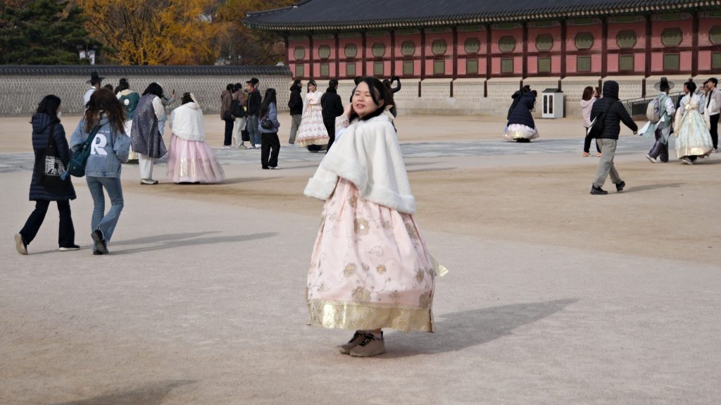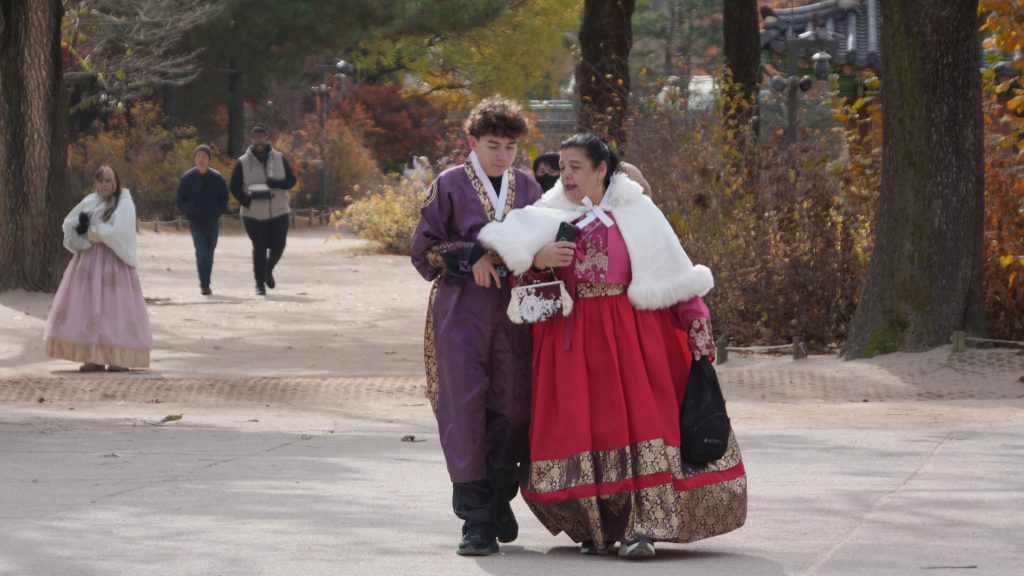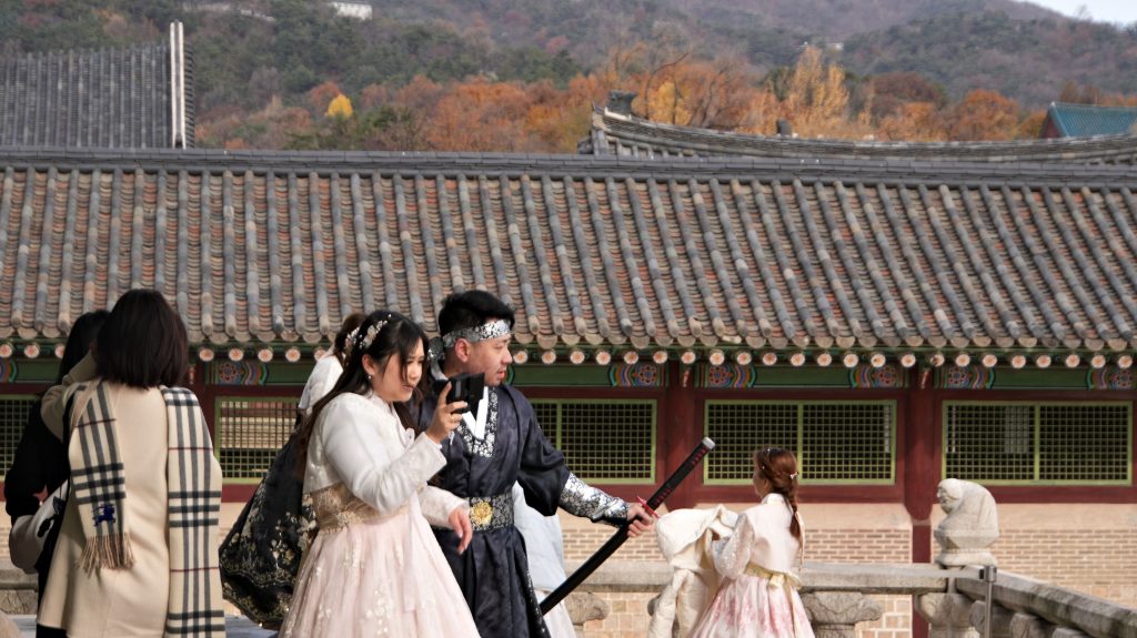 Hier am Palast ist das nochmal verstärkt, denn wer in traditioneller Kleidung erscheint, bekommt freien Eintritt. Rund um den Palast kann man überall die Hanboks stundenweise leihen, und es tragen ähnlich viele Koreaner ihre Tracht wie Bayern auf der Wiesn.