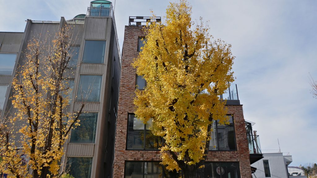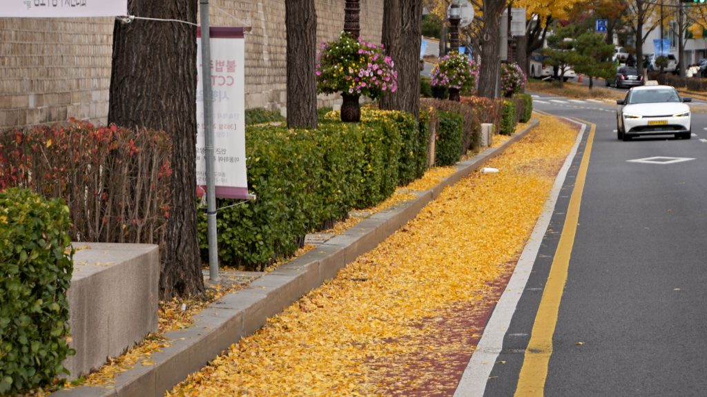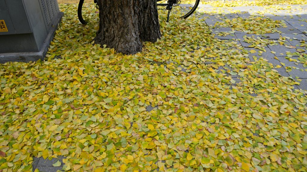 Ich bin immer noch hin und weg von der Farbpracht der Bäume hier im Herbst, die gelben Gingkos und die rostroten Ahorne lassen die ganze Stadt leuchten! Säckeweise wird das fallende Laub vor allem der Gingkobäume hier zusammengekehrt, ein einzelner Baum kann bis zu 200.000 Blätter verlieren – und die stehen hier alle paar Meter.
