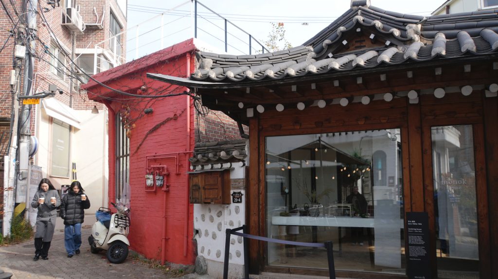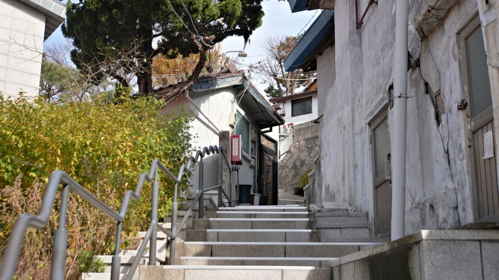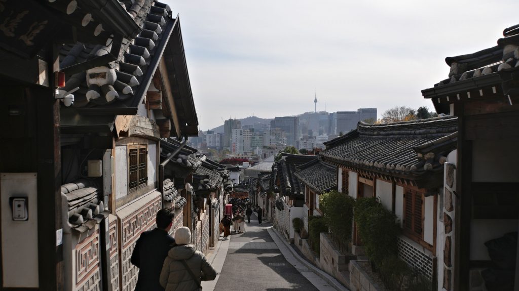 Das Bukchon Hanok Village ist aber sehr schön, vor allem der Kontrast zwischen den kleinen Häusern hier und den Hochhäusern im Hintergrund zeigt den rasanten Aufstieg des Landes. Die Häuser sind alle bewohnt, und darum erinnert an jeder Straßenecke ein Schild daran, dass Touristen hier nachts nicht erwünscht sind, 100.000 Won (60€) Strafe kostet ein Betreten der Gegend als Nicht-Anwohner.