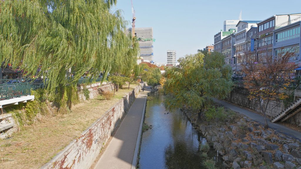 Marc trifft zu und, und wir wollen noch einen zweiten Palast besuchen, aber der hat Montags geschlossen. Stattdessen laufen wir durch den Schlosspark und kommen weiter südlich zum Cheonggyecheon-Bach, in dem ein Reiher aufgeplüstert genauso friert wie ich.