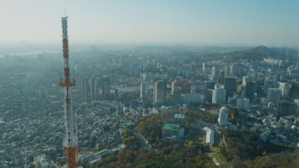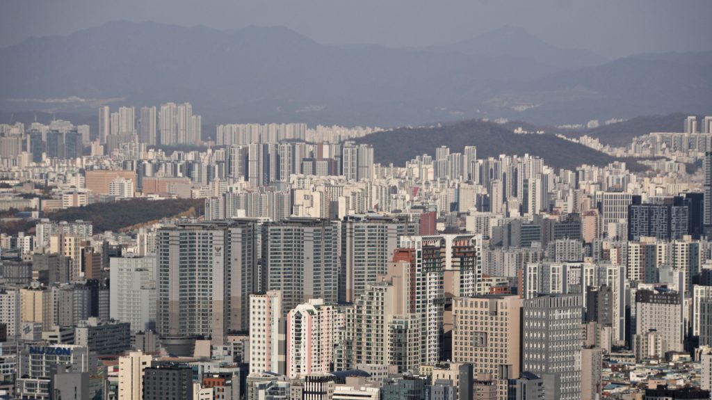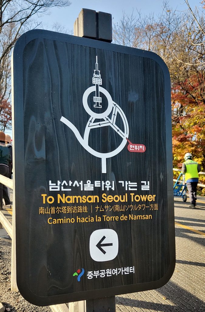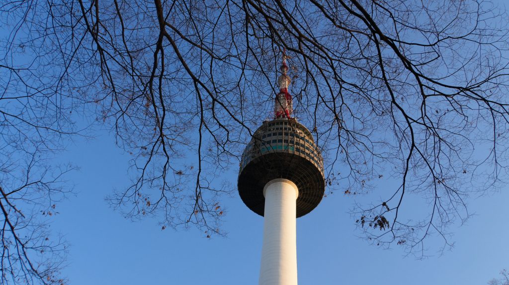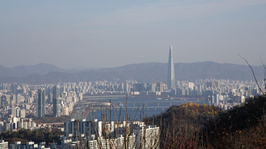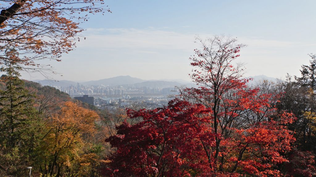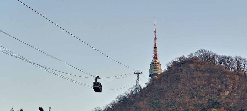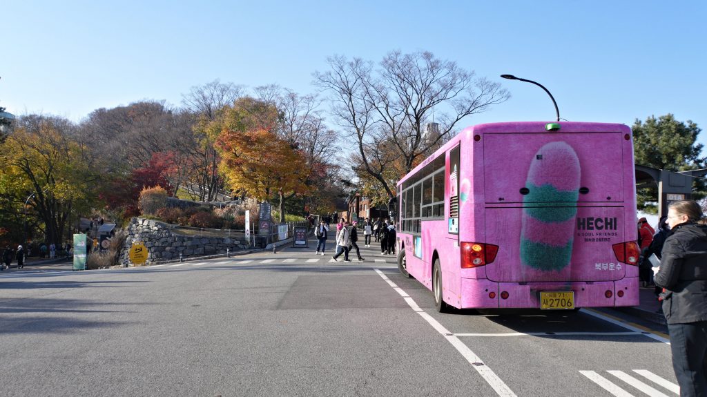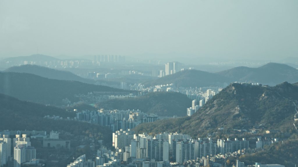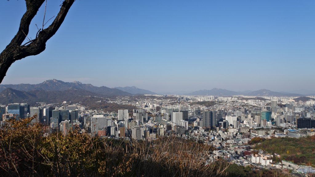 Mit einem Bus geht es jetzt auf den 270m hohen Namsan – das heißt "Südberg", denn er ist im Süden des historischen Stadtzentrums. Der Fahrer ist flott unterwegs, und man muss sich sehr gut festhalten um nicht in den Kurven umzufallen, eine Mutter wird von ihrem erwachsenen Sohn aufgefangen, als es zackig um die Kurve der steilen Straße geht. Von hier oben erkennen wir erstmals die Größe dieser Stadt: Von Horizont zu Horizont stehen die Hochhäuser wie Dominosteine, der Ballungsraum Seoul ist flächenmässig sogar noch ein klein wenig größer als Los Angeles County, aber hat fast drei Mal so viele Einwohner. Mit 26 Millionen Menschen leben knapp halb so viele Menschen wie in ganz Spanien allein in diesem Ballungsraum. Ich bin ernsthaft erstaunt, dass trotz des verhältnismässig kleinen U-Bahn-Netzes der Verkehr nicht komplett kollabiert.