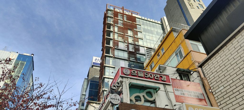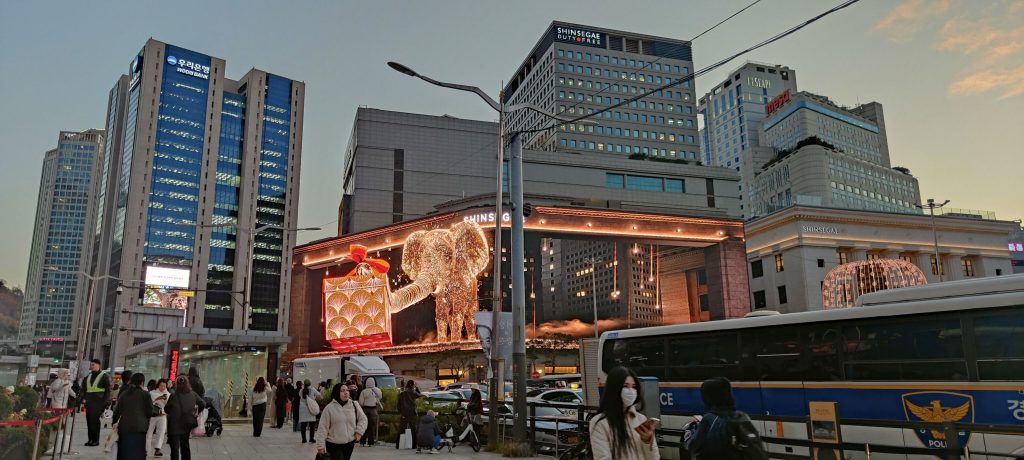 Oben sind wie überall große Werbebildschirme, aber an der Shinsegae Mall wird es grotesk: Fast 72 Meter breit und 18 Meter hoch ist der extrem brillante 8K-Bildschirm ("Media Façade"), auf dem jahreszeitbedingt natürlich Weihnachtswerbung läuft. Das ist ein echter Hingucker, und das Filmchen ist gut produziert – es entsteht sogar durch Tricks wie die künstlichen Fassadenelemente im Rahmen ein leichter 3D-Effekt. Ich muss an den 3D-Hai aus "Zurück in die Zukunft II" denken, der Marty dort so erschreckt – wir sind davon nicht mehr weit entfernt!