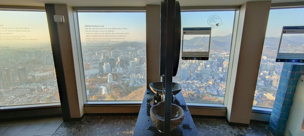 Der Posing-Wahn der Koreaner wird auch hier unterstützt, wie überall in der Stadt gibt es auch hier eine Fotokabine ("Don't lxxk up", in der die Kamera in der Decke ist), in der man für Gebühr Selfies machen kann. Selbst aus der Toilette hat man einen tollen Ausblick!