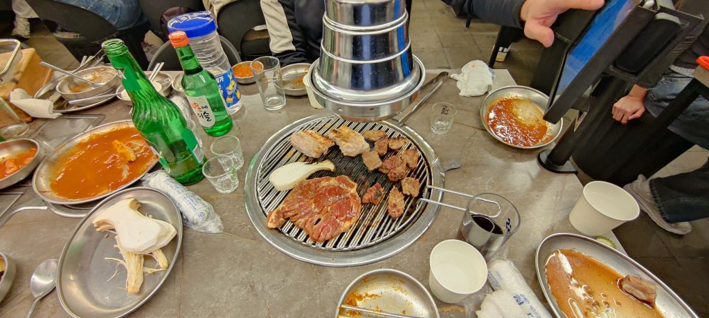 Zum Abendessen gehen wir mir Marc und zwei seiner sehr netten Freundinnen noch in ein Korean BBQ, wo man Fleisch und Gemüse am im Tisch integrierten Kohle-Grill brät und mit Kimchi isst. Kimchi ist extrem lecker, ich mag Chinakohl sowieso, aber fermentiert und in Soße schmeckt das richtig gut.