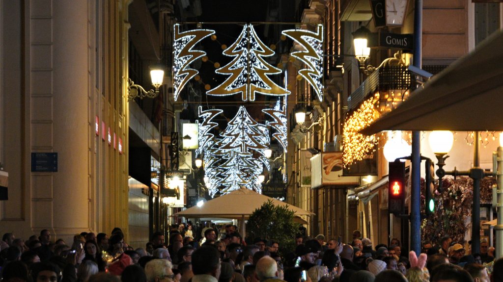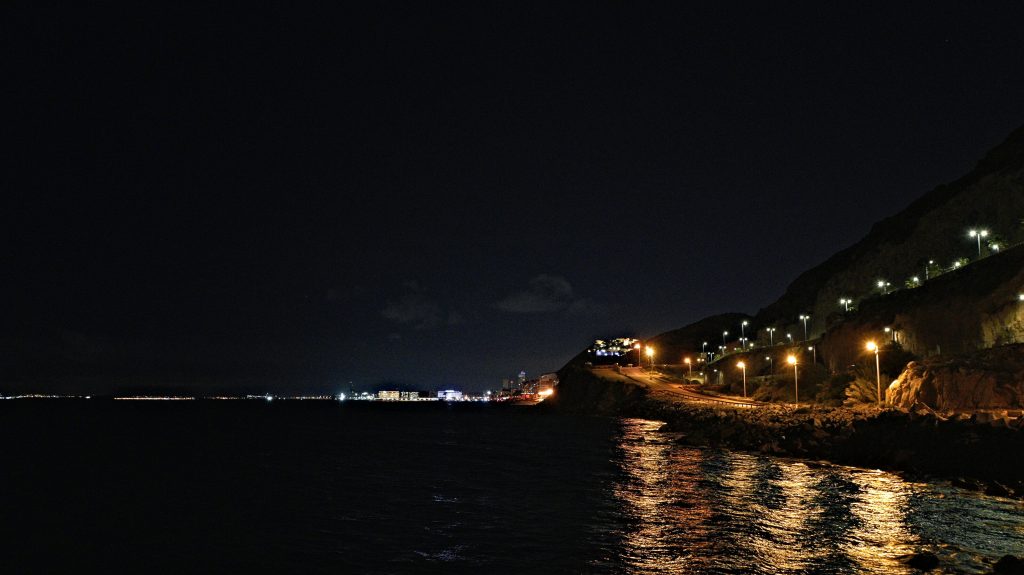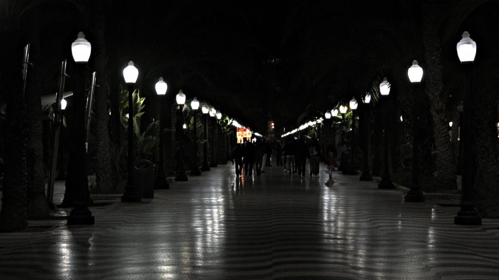 Wir laufen ein wenig kreuz und quer durch die Stadt, es ist schon gut was los; und weil es hier deutlich milder ist, kann man auch draußen sitzen und ein Vermütchen genießen. Alicante ist ein sprachlicher melting pot – man hört Valenciano, eine Variante von Katalonisch, das im Osten Spaniens gesprochen wird, natürlich Castellano ("spanisch"), aber auch sehr viel Englisch. Während die reichen englischen Rentner sich in Malaga finden, ist hier eher der Hotspot der Benidorm-Touristen, die irgendwann einfach nicht mehr heimgefahren sind. Benidorm liegt etwa 40 km Luftlinie die Küste hoch, und man kann von hier aus den markanten Felsen und die Hotelburgen davor sehen. Jetzt in der Nacht natürlich nicht, aber es ist schon sehr auffallend, wie viele Briten hier leben.