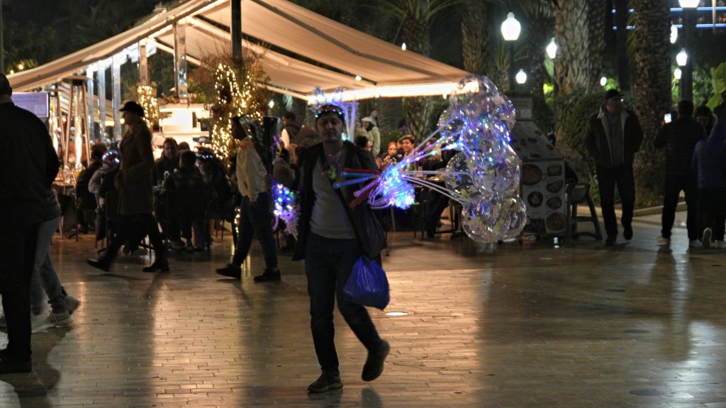 Wir sitzen in der zweiten Reihe vom Strand vor einer Bar, und beobachten die teilweise schon gut angetrunkenen Menschen, kaufen uns auch ein bisschen blinkenden Plastikmüll von einem der vielen StraßenverkäuferInnen, und genießen.