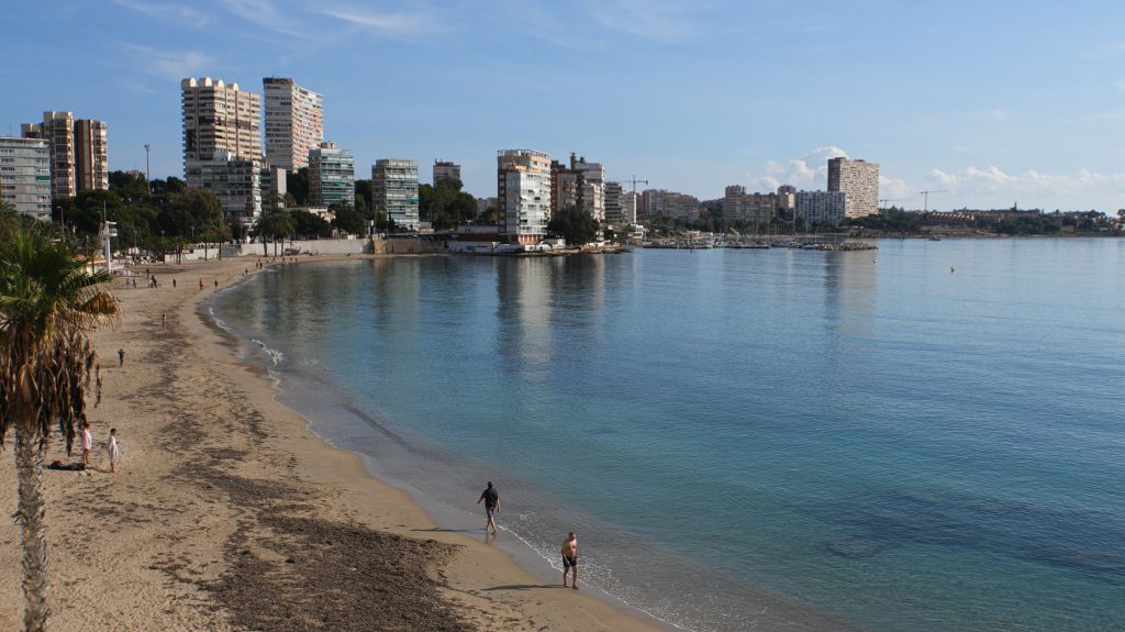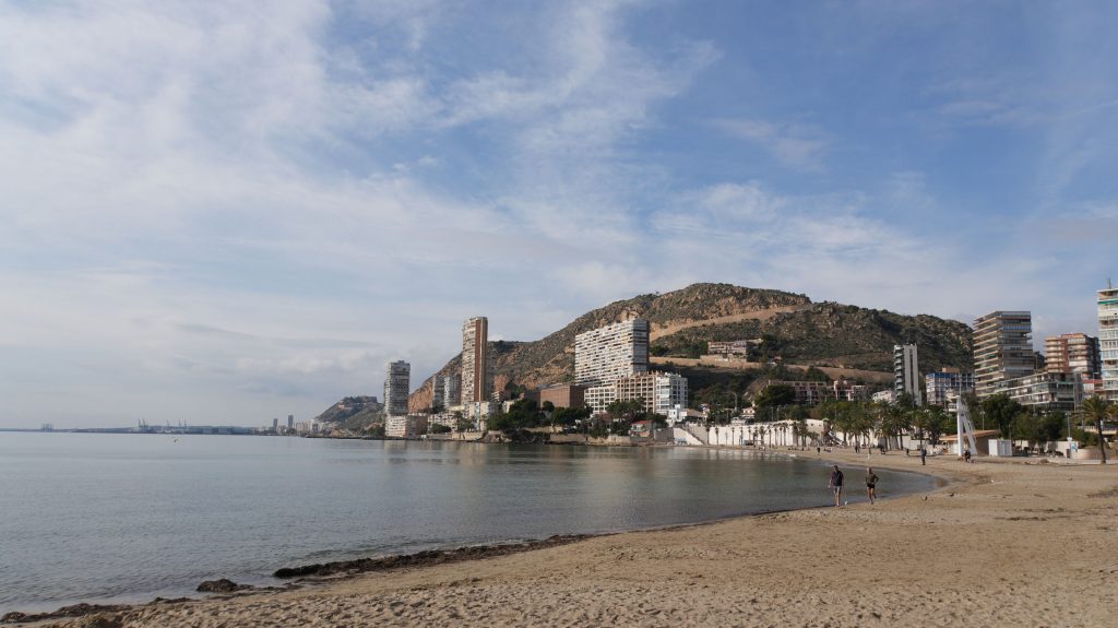 Am Morgen muss Gabi erst einmal ein bisschen arbeiten, aber gegen Mittag können wir los. Das Wetter ist ein Träumchen, die Sonne scheint, es hat um die 16 Grad, und von der Enge zwischen Hochhaus und Felswand laufen wir zum Strand von Albufereta.