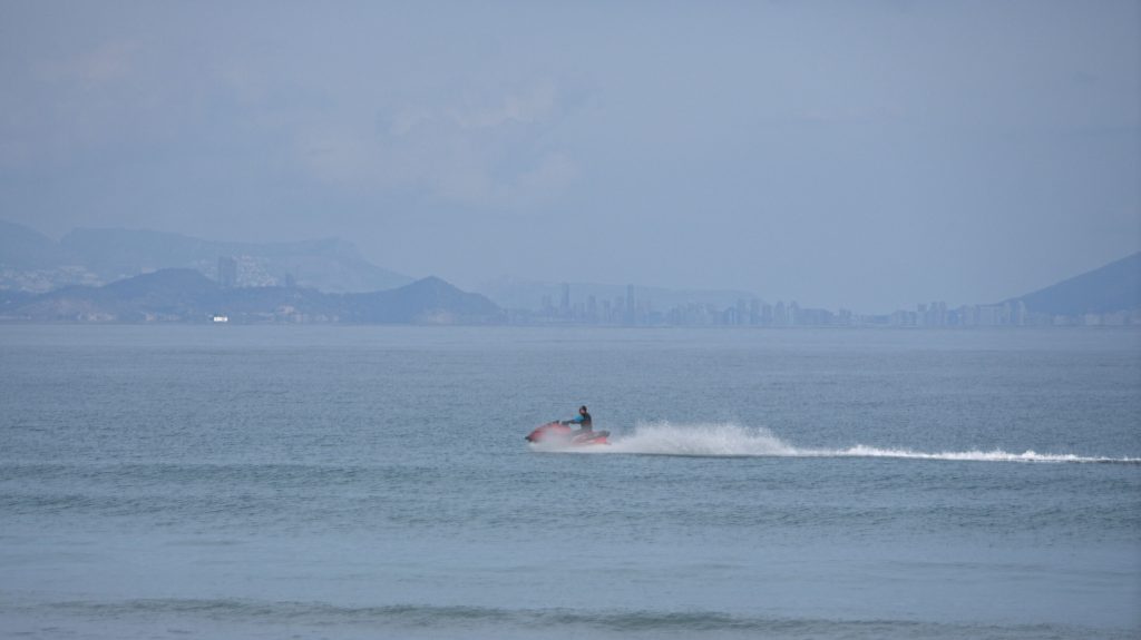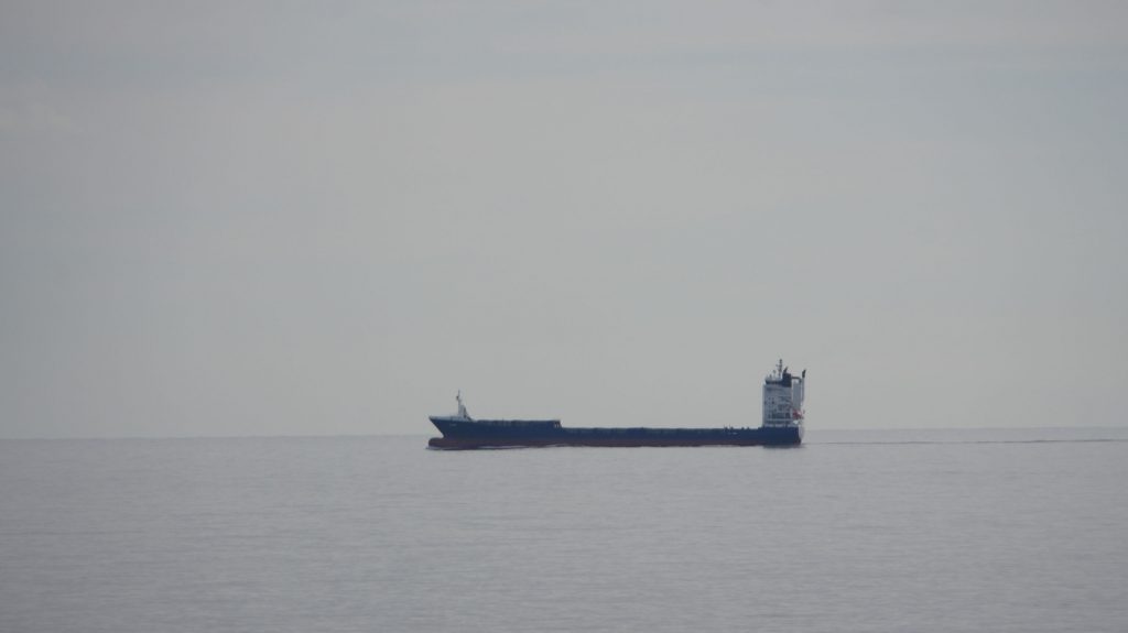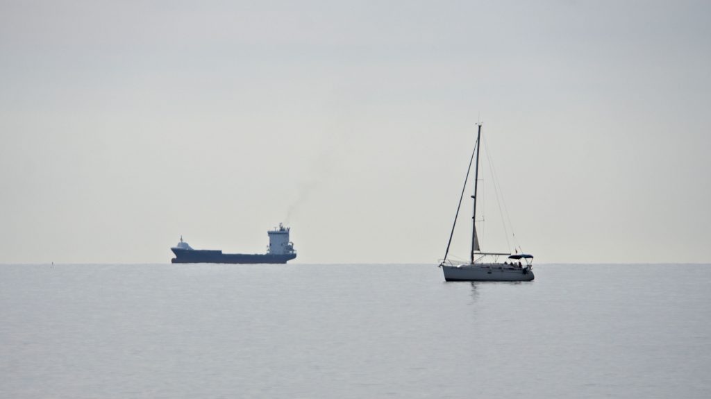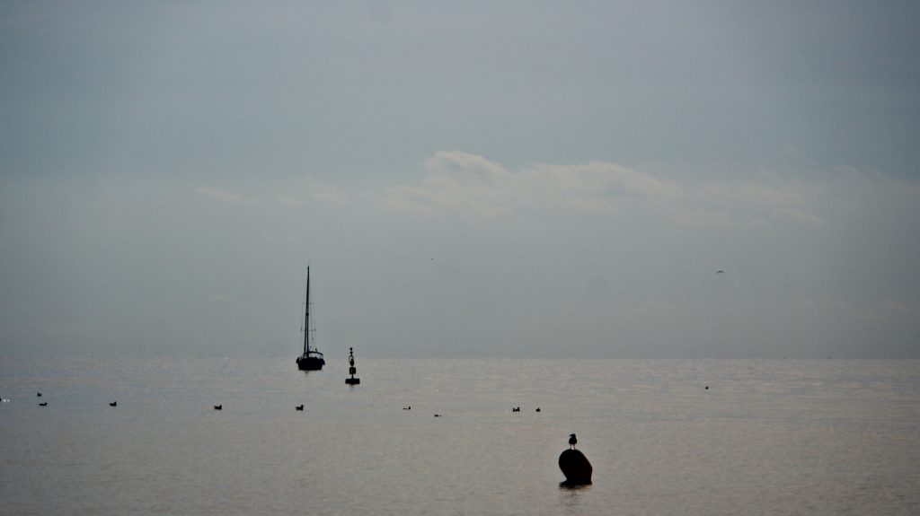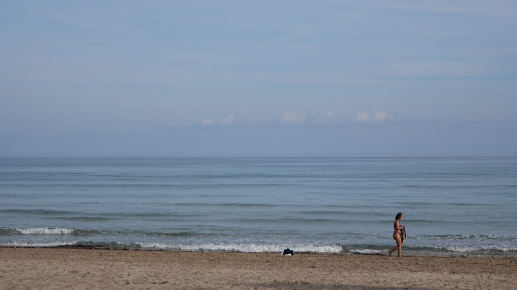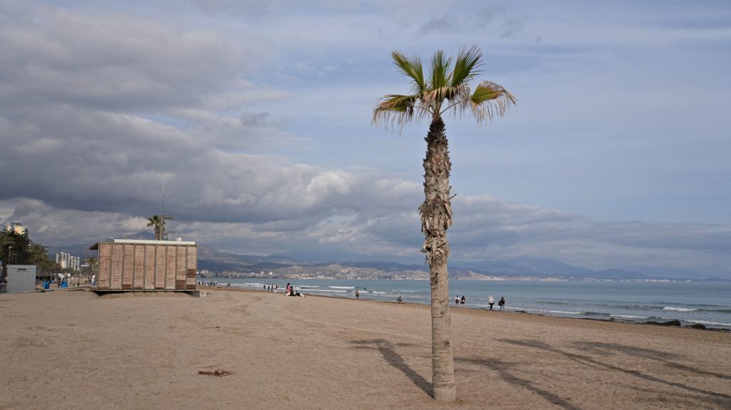 Große Schiffe kommen nicht so viele hierher, obwohl Alicante einen Hafen hat, aber ich vermute, dass Valencia den Löwenanteil abbekommt. Ab und zu kommt aber doch ein kleines Containerschiff vorbei, und Segel- und Sportboote sind einige unterwegs. Auf dem Meer ist es wolkig, und so ist teilweise schwer zu sehen, wo die Grenze zwischen Meer und Himmel verläuft.
