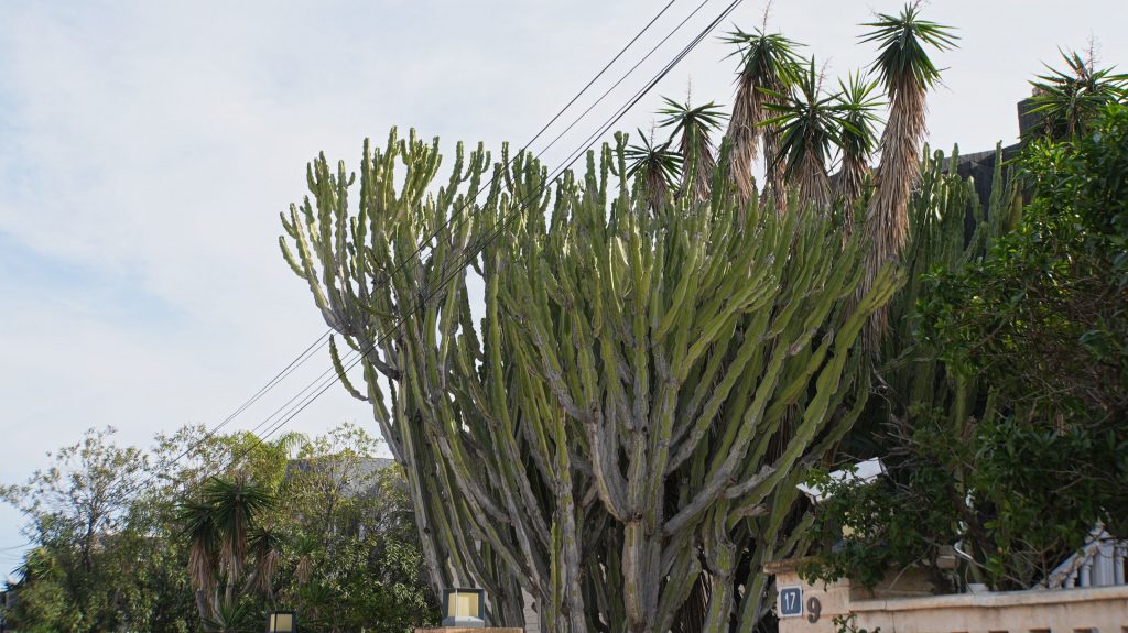 Der Wanderweg führt uns zum Playa de San Juan, ein kilometerlanger Sandstrand mit Palmen, wo wir uns ein nettes Strandrestaurant suchen. Während wir am Futtern sind, rauscht am Radweg plötzlich ein nur mit einem Tanga bekleideter Mann auf Rollerskates vorbei – unter johlenden Applaus der meisten Gäste. Leider war ich zu langsam, und die Kamera hat auf die Glatze eines Gastes statt auf den Rollerblader scharf gestellt.