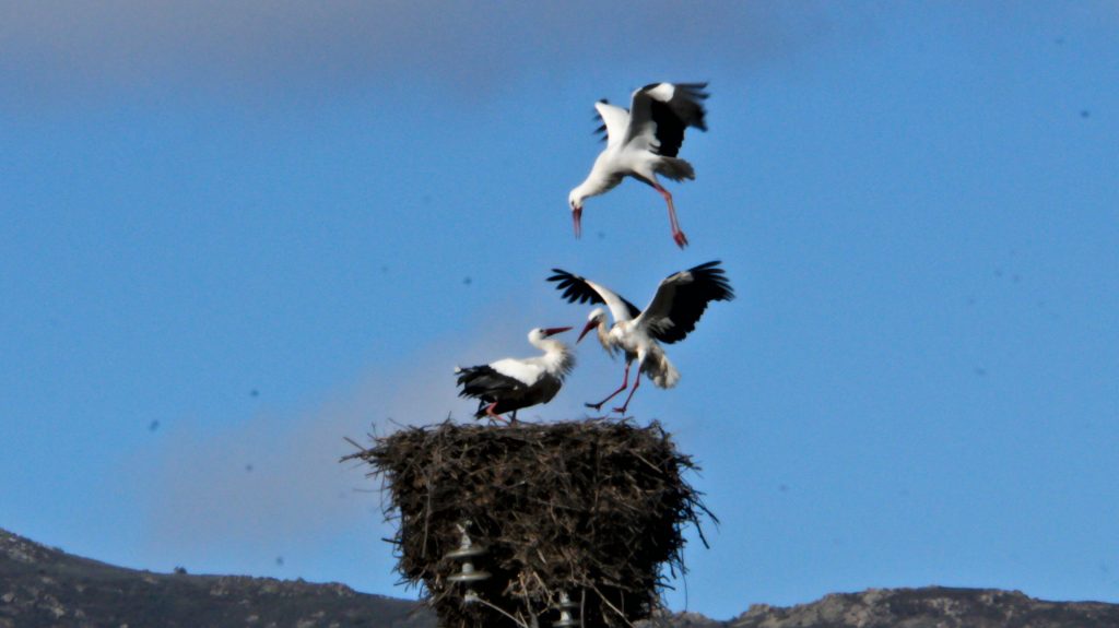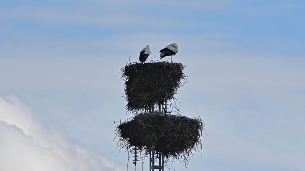 Also kehren wir um, und werden Zeuge eines versuchten Verbrechens: Ein Storch holt im steilen Flug Schwung, fliegt dann mit hoher Geschwindigkeit flach auf das große Storchennest zu, und versucht das dort nistende Tier zu verjagen. Er hat jedoch nicht mit dem Partner (oder der Partnerin, ist bei Storchen schwer zu sagen) gerechnet. Das Tier hat bemerkt, was passiert, und kommt von oben zur Hilfe. Nach kurzem Gerangel gibt der Angreifer auf, taumelt vom Nest und sucht das Weite.