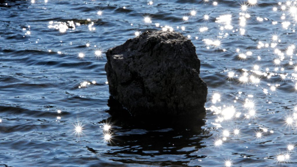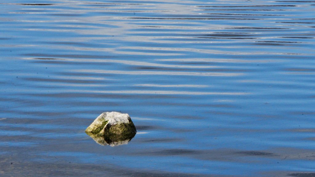 In der Sonne ist der See so richtig knalleblau, und kontrastiert schön mit dem Weiß-Blau des Himmels und dem braunen Streifen Land dazwischen.